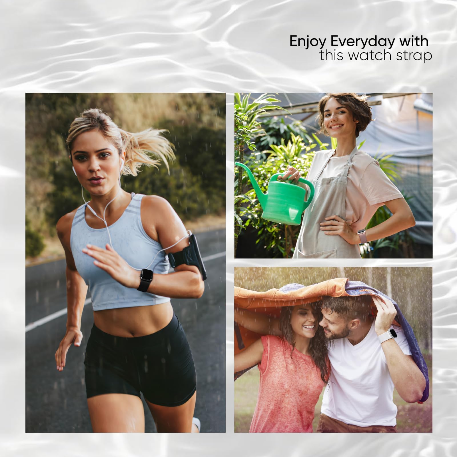 - עמיד במים: רצועת השעון החדשנית והגמישה שלנו, העמידה בפני התזות, מאפשרת לטיפות להחליק מהמים, מה שמאפשר לה להתמודד עם זיעה, גשם קל ואפילו התזות מקריות ללא בעיות. עבור סוגים מסוימים של שפיכה על רצועת השעון הזו, כמו קפה, שטיפה מהירה תחת מים תוך דקה ותקבלו רצועה נקייה.