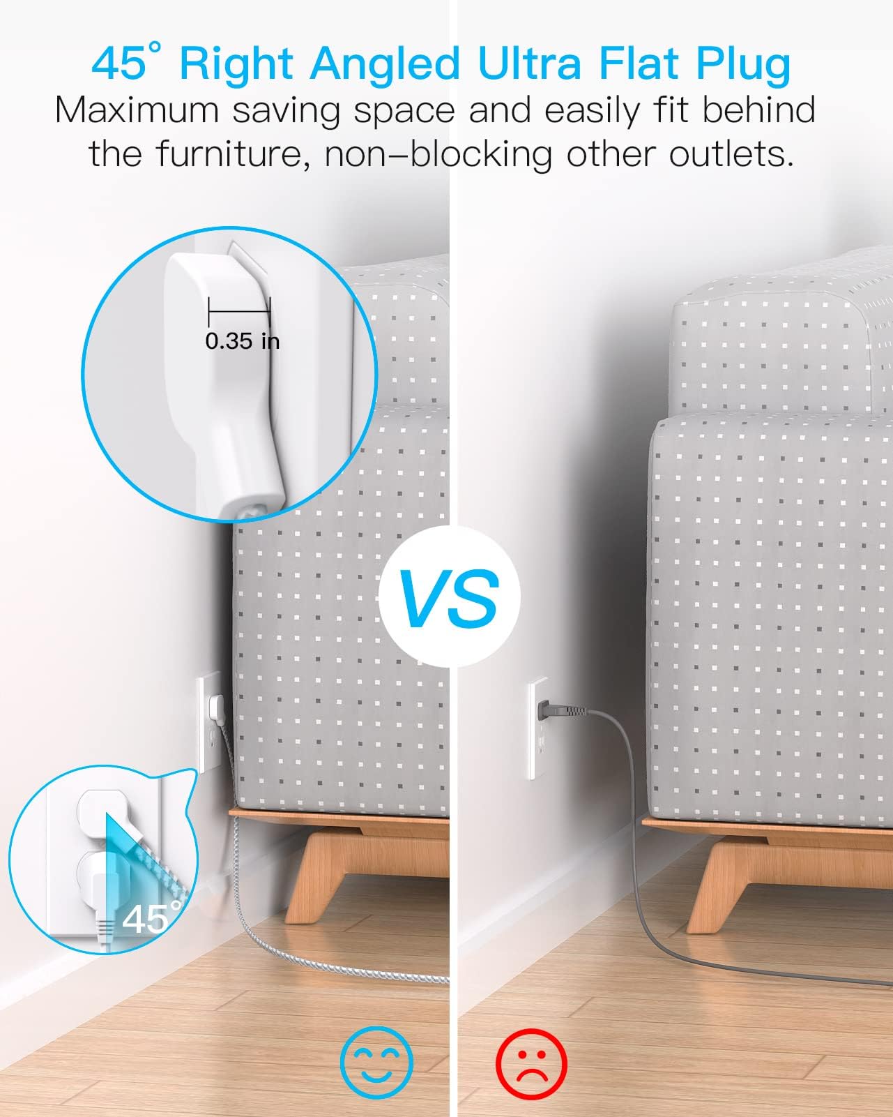 - 【תקע שטוח במיוחד בזווית ישרה וכבל מאריך קלוע באורך 3 מטרים】 - עם תקע דק במיוחד בגודל 0.35 אינץ' בלבד ועיצוב בזווית ישרה של 45 מעלות, שהוא דק בהרבה מתקעים מסורתיים, ניתן להיסגר בקלות לקיר ולהסתתר בחלק האחורי של רהיטים, ללא בזבוז שקעים ומקום. כבל מאריך בעובי 3 מ"מ עשוי נחושת טהורה, בעלת קיבולת נשיאת זרם טובה יותר (15A). כבל החשמל הקלוע אינו קל לעיוות, עמיד ובטוח יותר.
