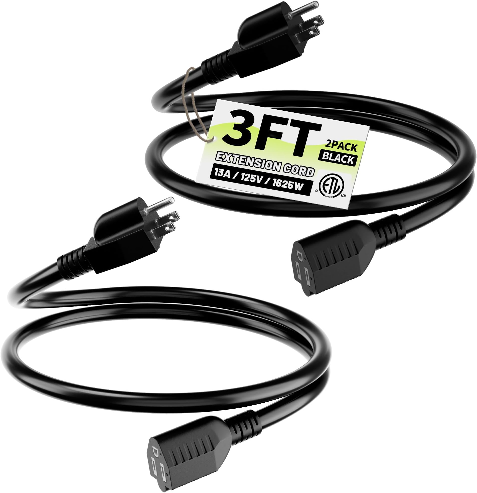 כבל מאריך שחור 16/3 לפנים ולחוץ, 3 רגל, חבילה של 2 כבלי מאריך עמידים למים ועמידים לעומס עם תקע מוארק 3 שיניים, 13A 1625W 16AWG SJTW, כבל חשמל גמיש ועמיד למים