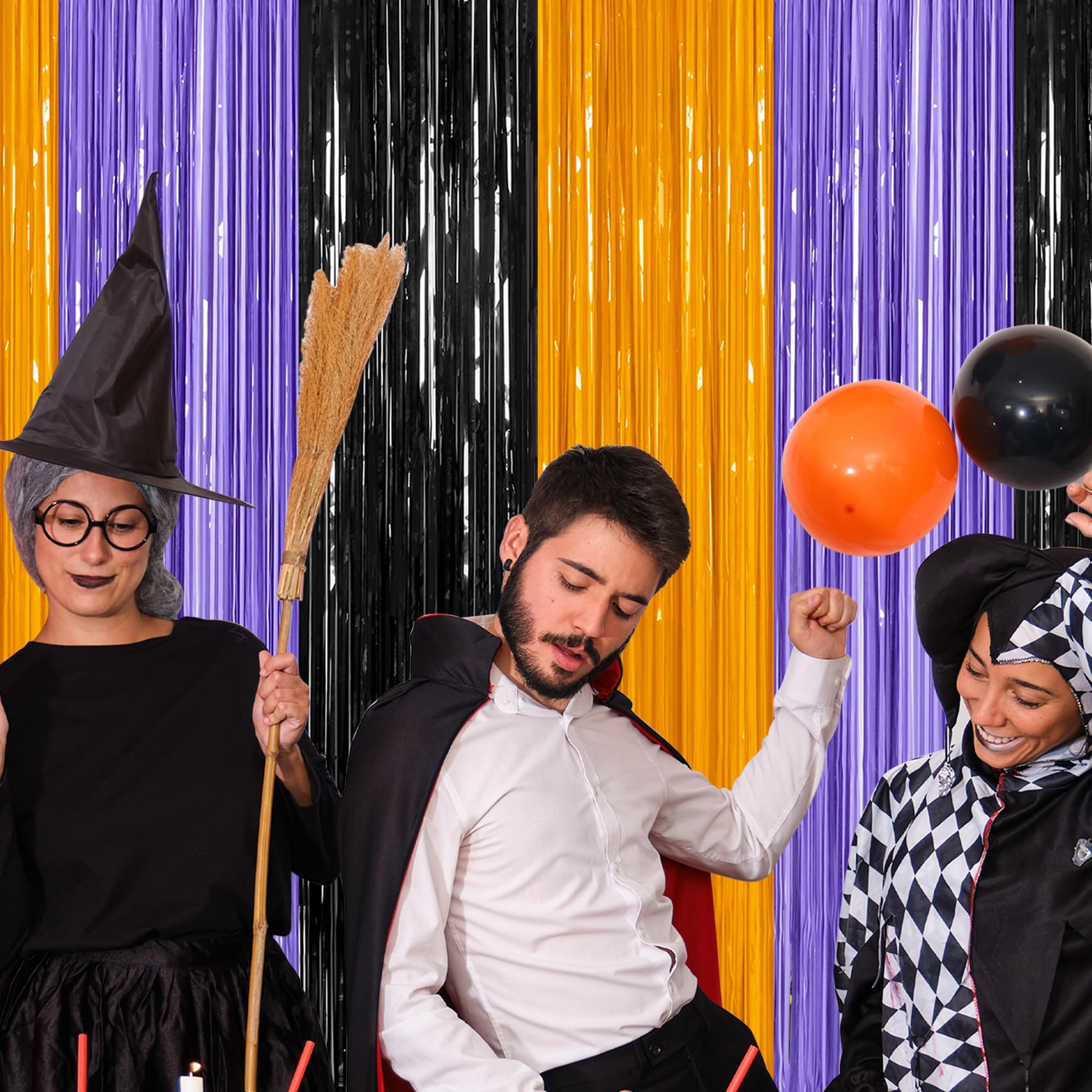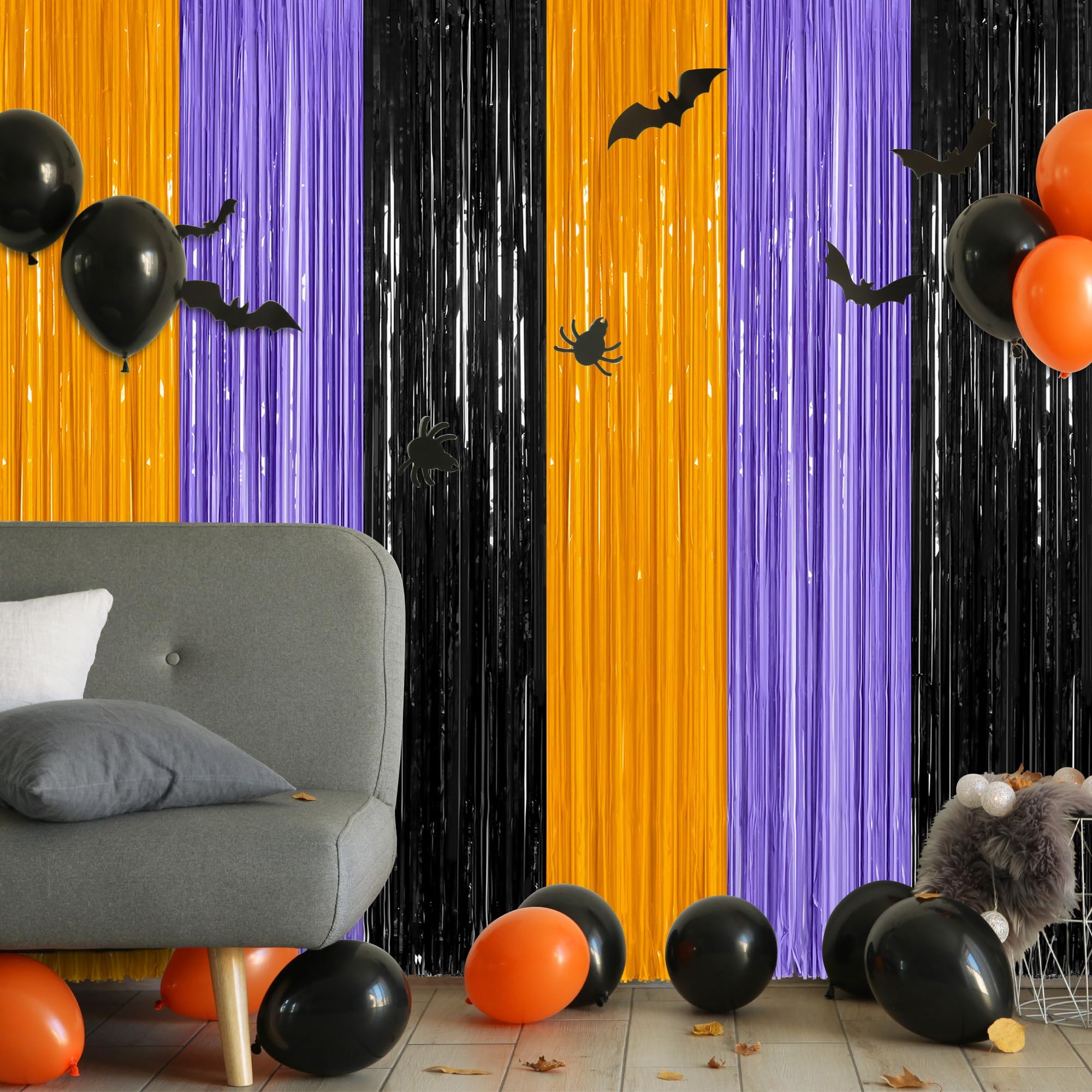 חבילה של 2 תפאורות ליל כל הקדושים, וילונות שוליים לסכל בגודל 3.28 רגל x 7.05 רגל, וילונות רקע טינסל בצבע כתום סגול שחור למסיבה, קישוטי ליל כל הקדושים, אביזרי תמונה לדלת, ציוד למסיבה