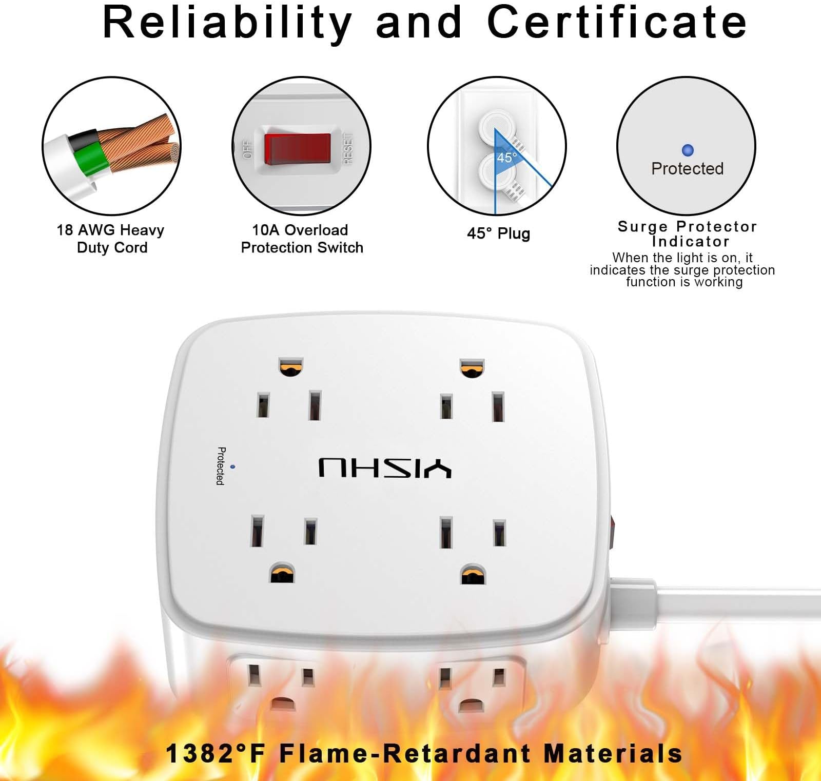 - 【הגנה רב-תכליתית】 - אישורי ETL. מפצל חשמל זה כולל הגנה מפני עומס יתר, הגנה מפני קצר חשמלי, הגנה מפני זרם יתר, הגנה מפני מתח יתר והגנה מפני התחממות יתר. מגן נחשולי מתח עם הגנה מפני עומס יתר מגן על מכשירי החשמל שלך מפני תאורה, נחשולי מתח או קפיצות מתח. קיבולת ספיגת אנרגיה מינימלית של 600 ג'אול. הוא ינתק אוטומטית את החשמל כדי להגן על המכשירים המחוברים כאשר נחשולי מתח חזקים.