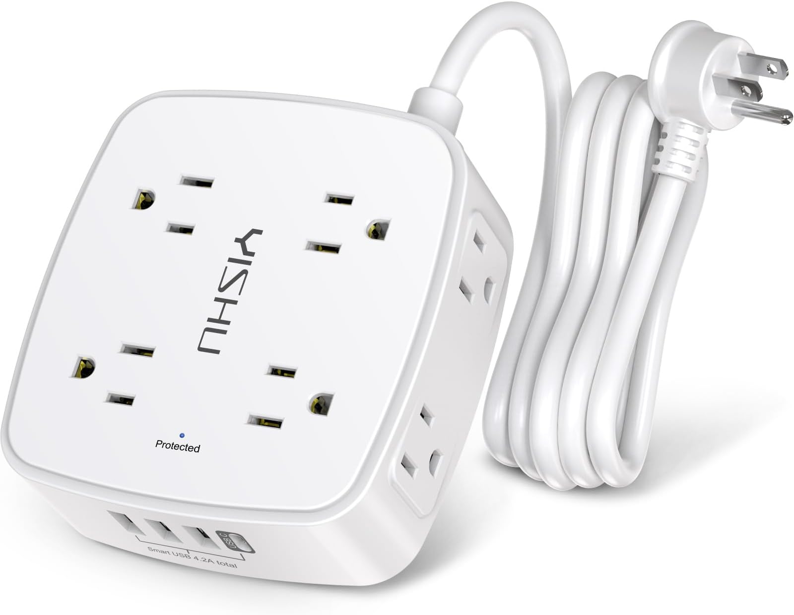 מפצל חשמל נגד נחשולי מתח באורך 1.8 מטר - 8 שקעים רחבים עם 4 יציאות USB, 3 מאריכי שקעים צדדיים עם כבל מאריך באורך 1.8 מטר, תקע שטוח, תלייה על קיר, תחנת טעינה שולחנית עם USB, ETL, לבן