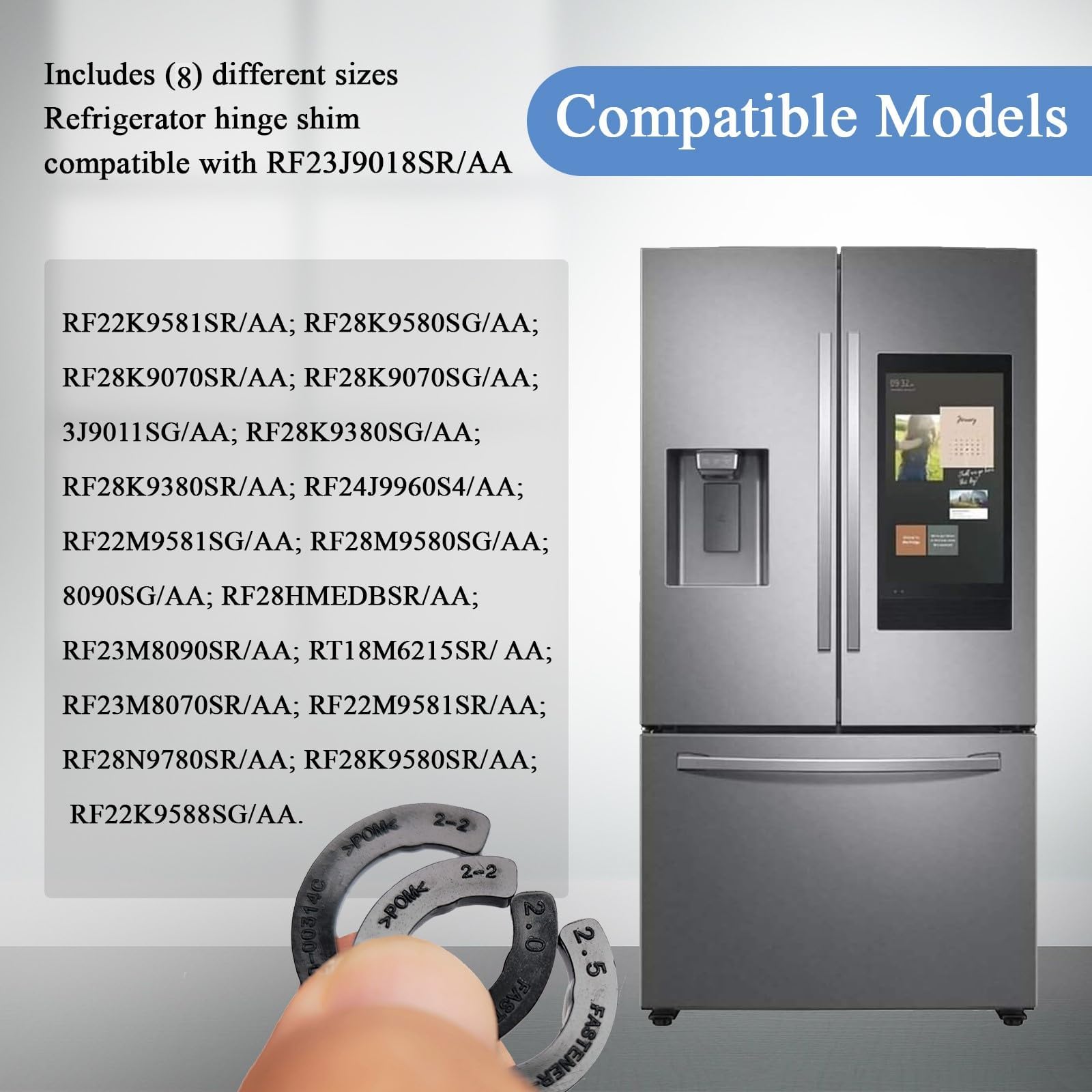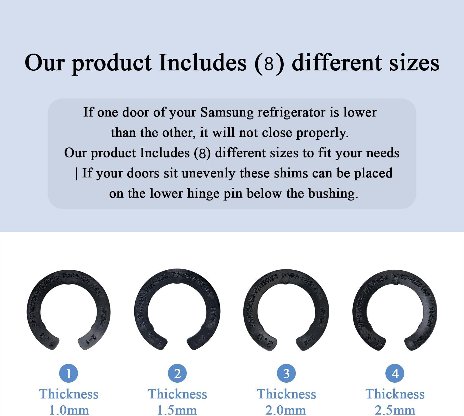 - ✨[פונקציית המוצר] אם דלת אחת של מקרר הסמסונג שלכם נמוכה יותר מהשנייה, היא לא תיסגר כראוי. המוצר שלנו כולל (8) גדלים שונים שיתאימו לצרכים שלכם | אם הדלתות שלכם יושבות בצורה לא אחידה, ניתן להניח את השיימס הללו על פין הציר התחתון מתחת לתותב.