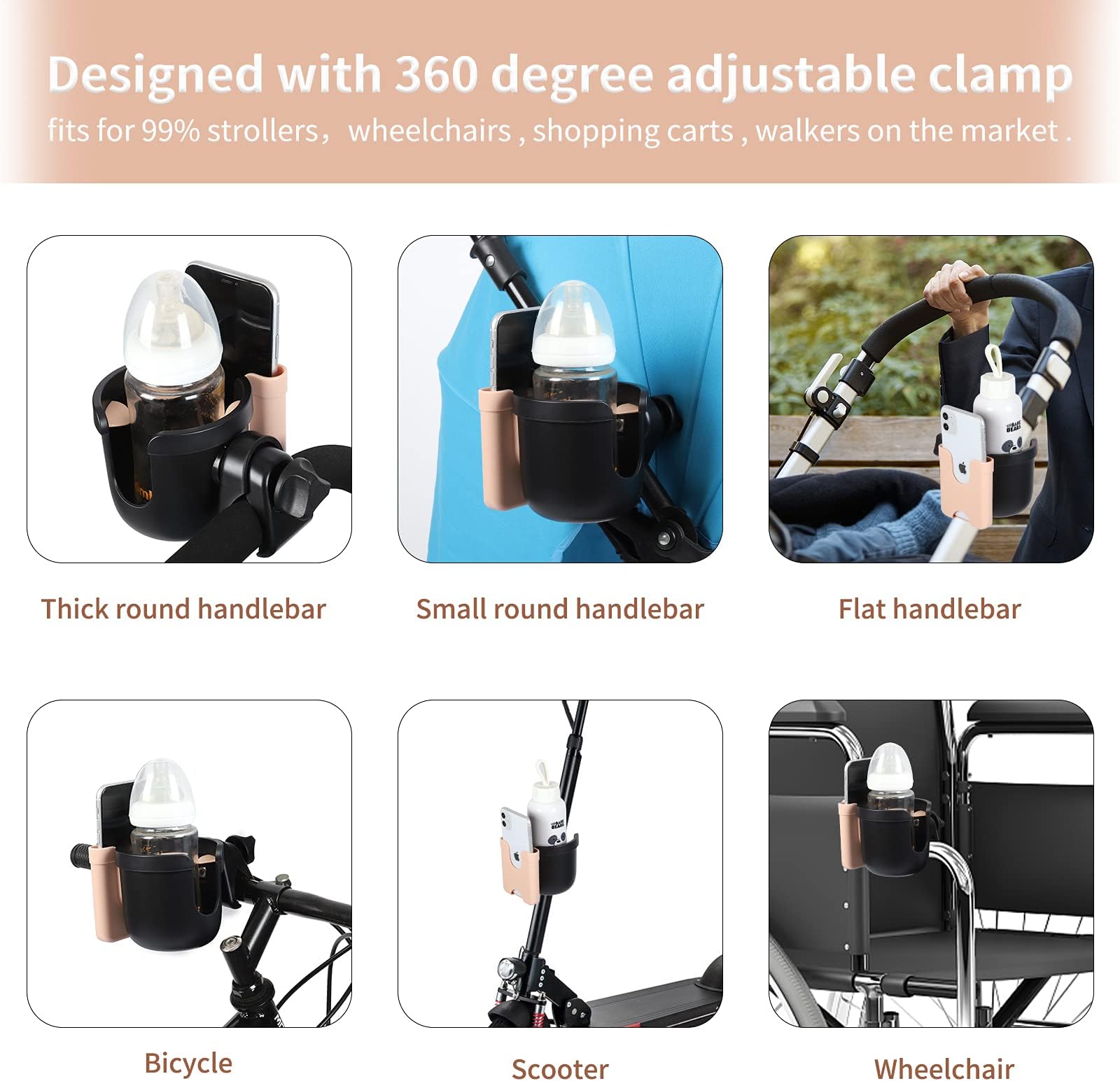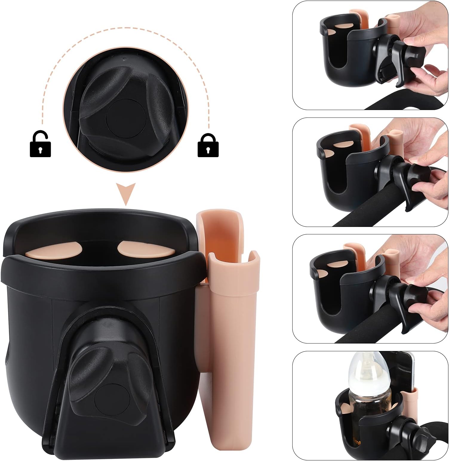 - מהדק יציב: המהדק מעוצב עם רפידת גומי, המסייעת לאבטח את מחזיק הכוסות על הכידון ללא כל תזוזה. הקליפס יכול להסתובב 360 מעלות, מה שמאפשר לך להתקין אותו בזוויות שונות. ניתן להתקין את מחזיק הכוסות של העגלה על הכידון, מתחת למושב, על הצינור התחתון, המזלג או הצינור הקדמי.