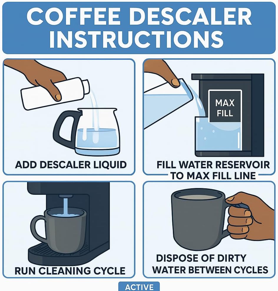 תמיסת הסרת אבנית למכונת קפה ACTIVE - 32oz (8 שימושים) תואם למכונות Keurig, Nespresso, Breville, Delonghi, Jura, Ninja - מנקה מכונת קפה אספרסו, ניקוי קנקן קפה מסיר אבנית