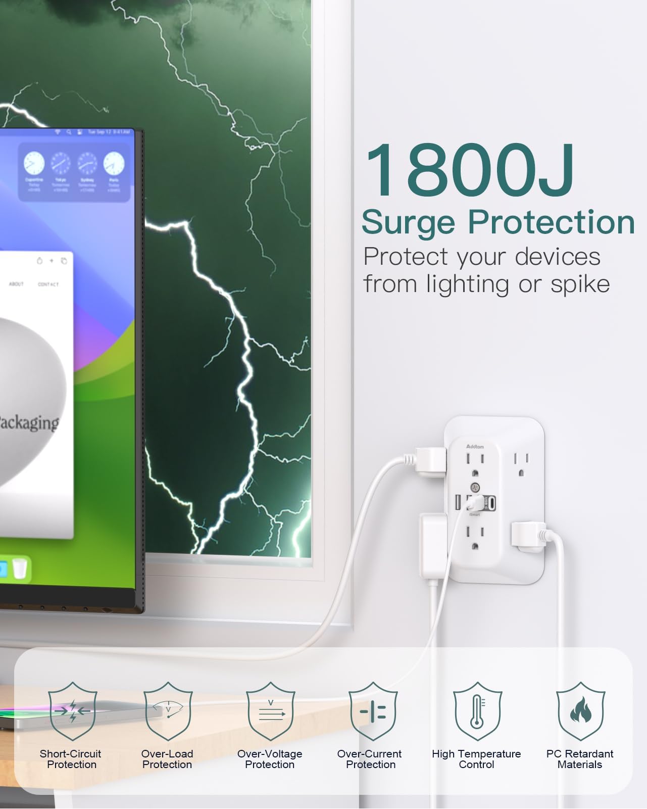 מאריך שקעים עם מגן מתח Addtam, מפצל 6 שקעים עם 4 מטען קיר USB (2 יציאות USB-C), שקע קיר רב תכליתי מפצל חשמל 1800J למשרד ביתי וחדר מעונות