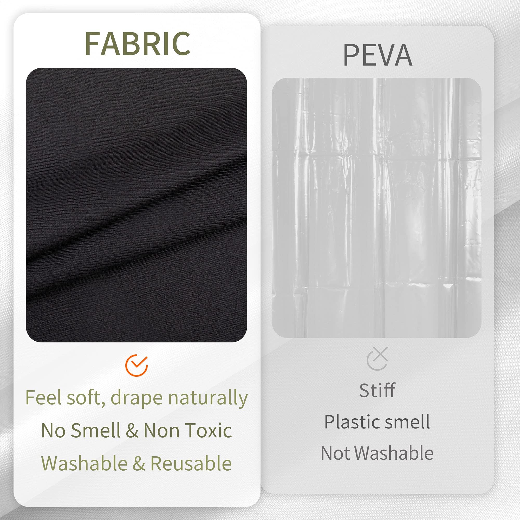 - בנייה איכותית: וילון מקלחת שחור זה מבד באיכות מלון הוא חסר ריח וללא PVC וללא BPA, ללא ריח פלסטיק כמו PEVA/EVA. הבד הארוג היטב מונע מהווילון להיספג ושומר על הרצפות שלכם נקיות מהתזות וריסוסי מים.