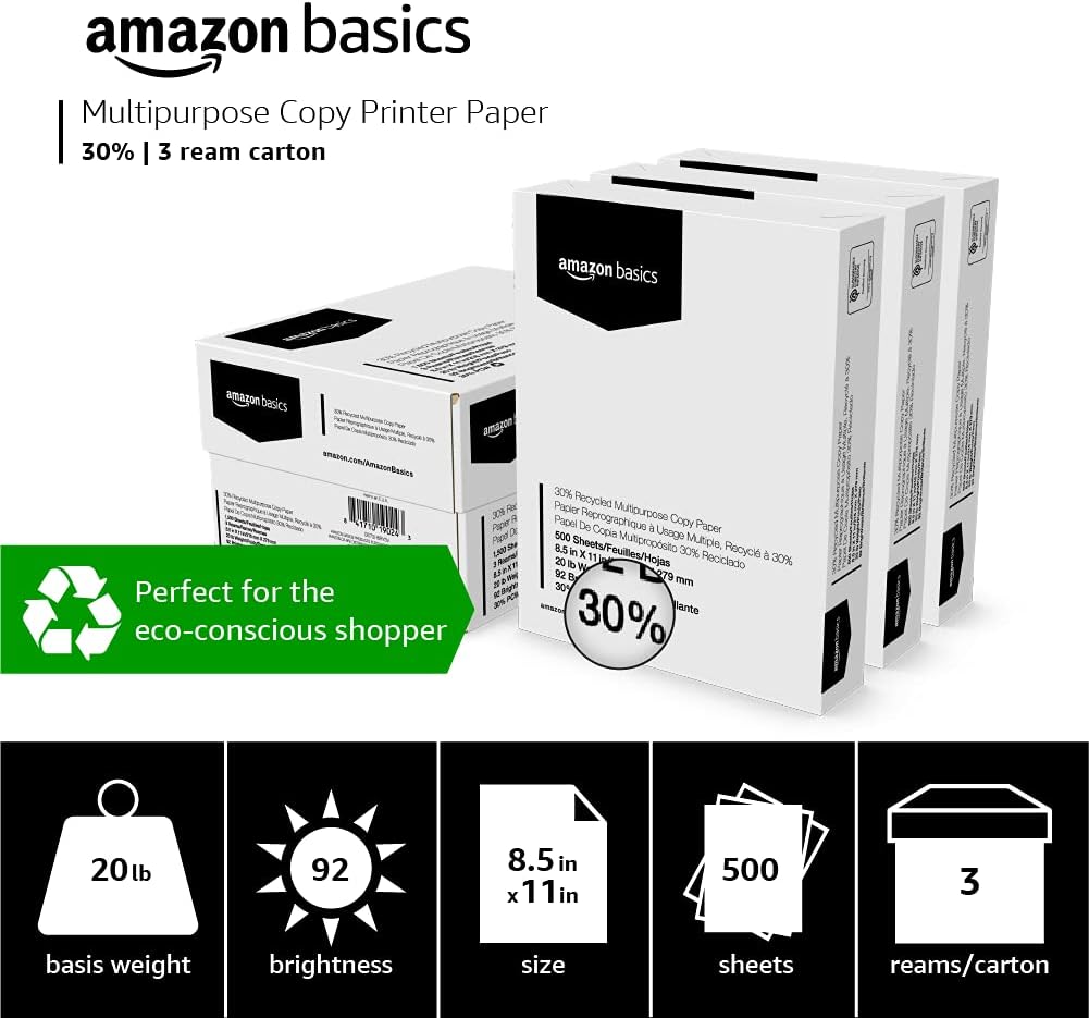 נייר הדפסה רב תכליתי Amazon Basics ממוחזר ב-30%, 8.5 x 11 אינץ', 20 ליברות, 3 רימים, (1,500 דפים), 92 בהיר, לבן
