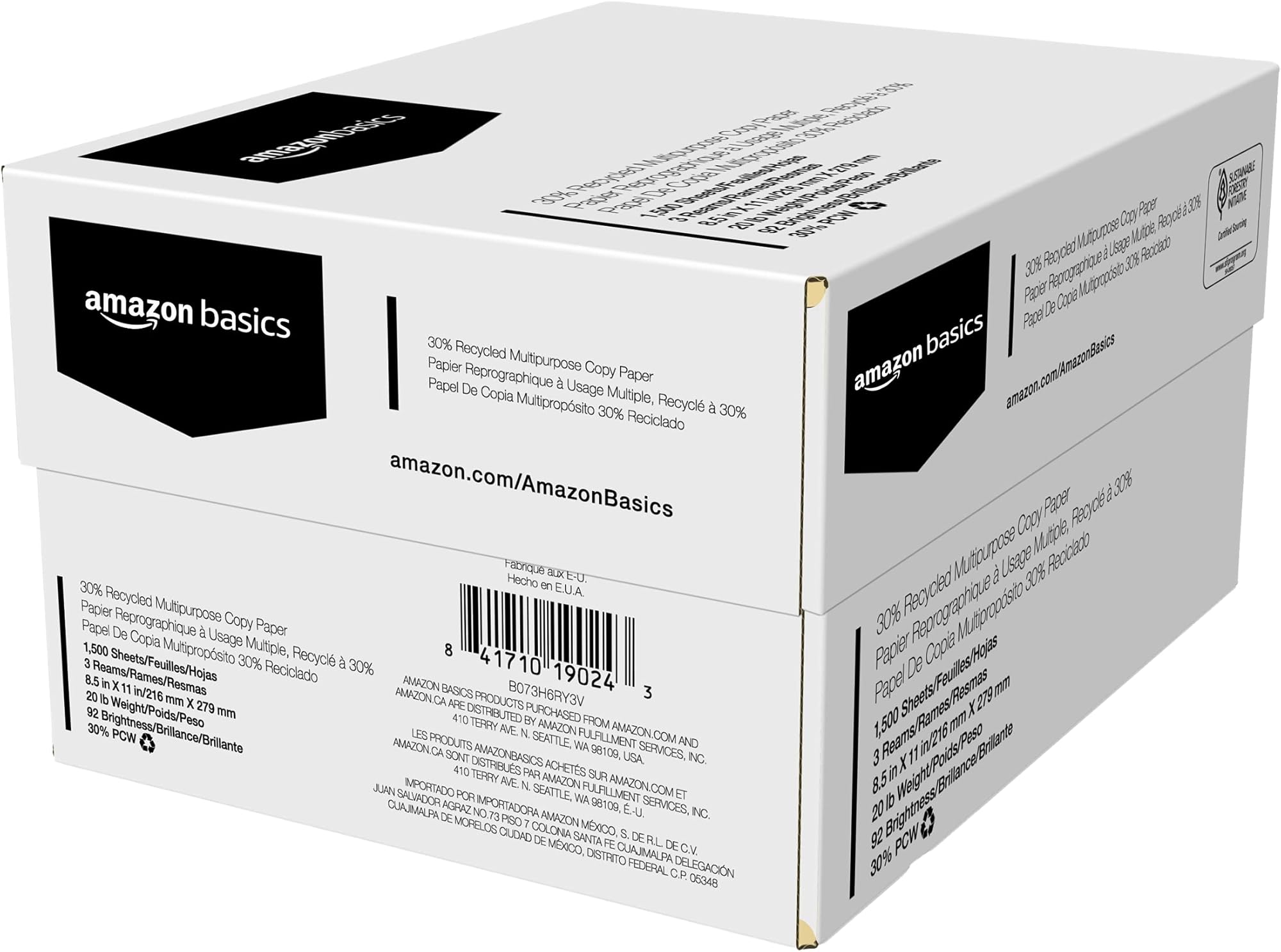 - ארגז של 3 חבילות (1,500 דפים) של נייר רב תכליתי לבן בגודל 8.5 x 11, ממוחזר ב-30%, למכונות צילום ומדפסות, לשימוש ביתי או משרדי