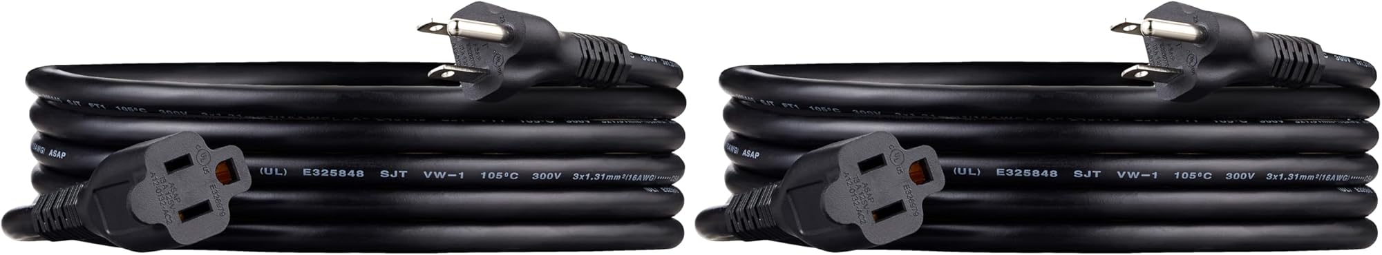 כבל מאריך של Amazon Basics, 13 אמפר, 125 וולט, 3 מטרים, שחור - חבילה של 2