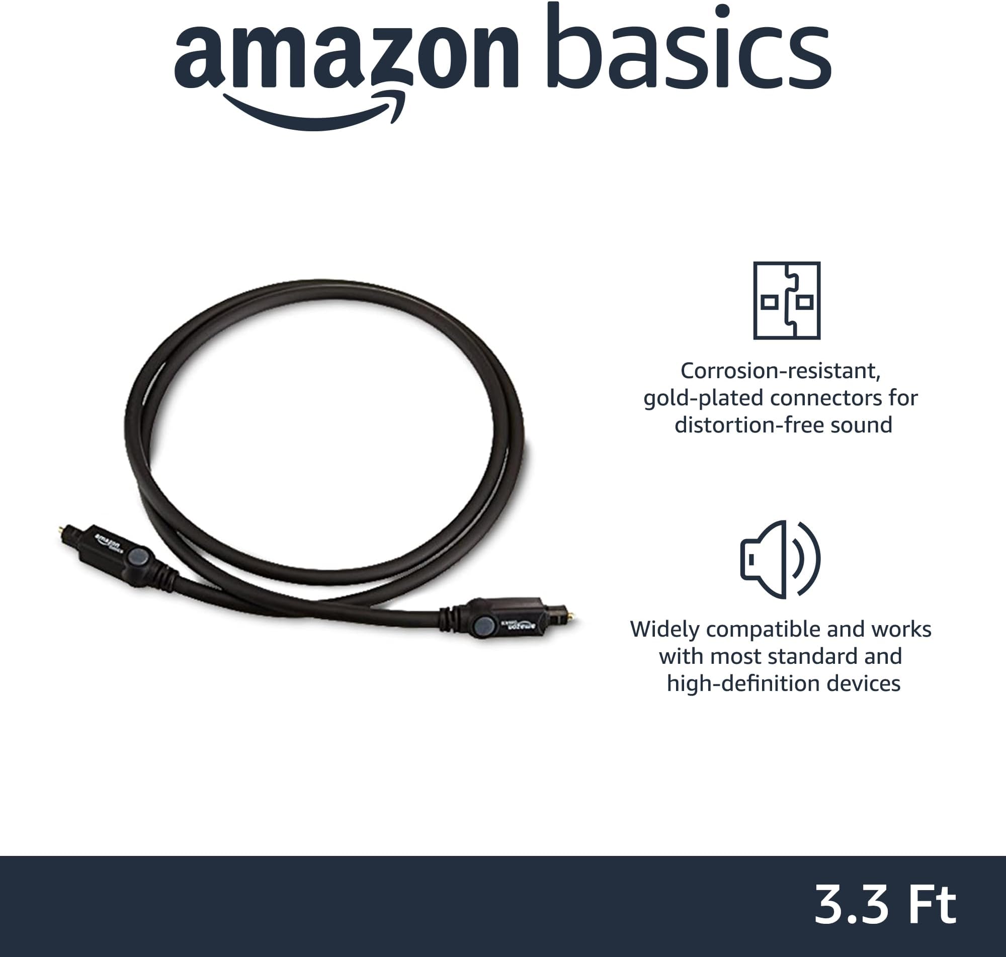 כבל אודיו אופטי דיגיטלי Toslink של Amazon Basics, רב ערוצים, למערכת שמע, סאונד בר, קולנוע ביתי, מחברים מצופים זהב, 3.3 רגל, שחור