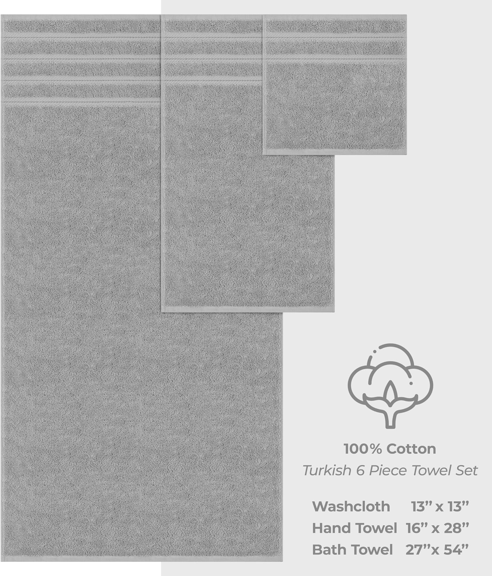 - סט מגבות טורקי יוקרתי בן 6 חלקים הכולל 2 מגבות אמבטיה בגודל 27 על 54 אינץ', 2 מגבות ידיים בגודל 16 על 28 אינץ' ו-2 מטליות רחצה בגודל 13 על 13 אינץ'.