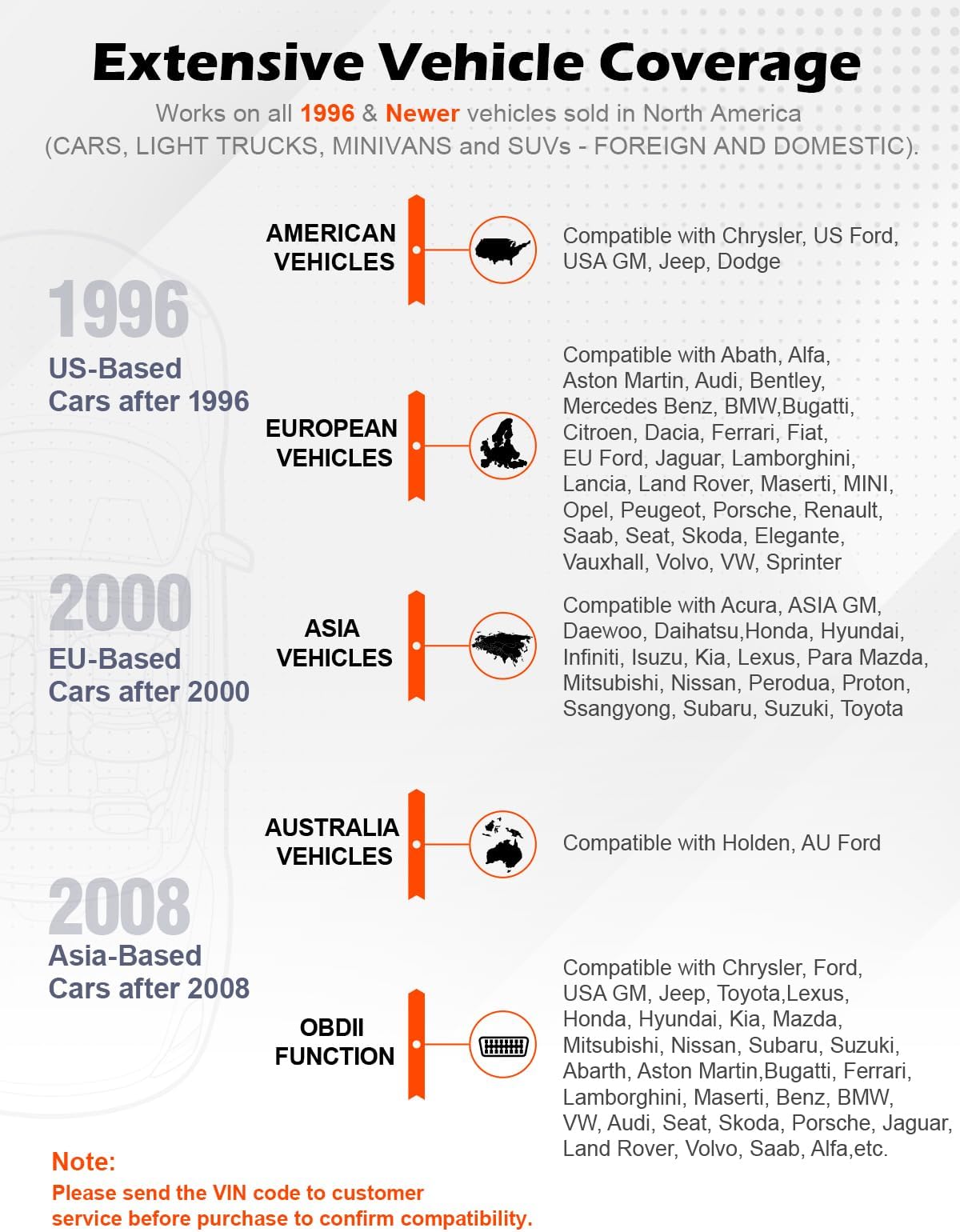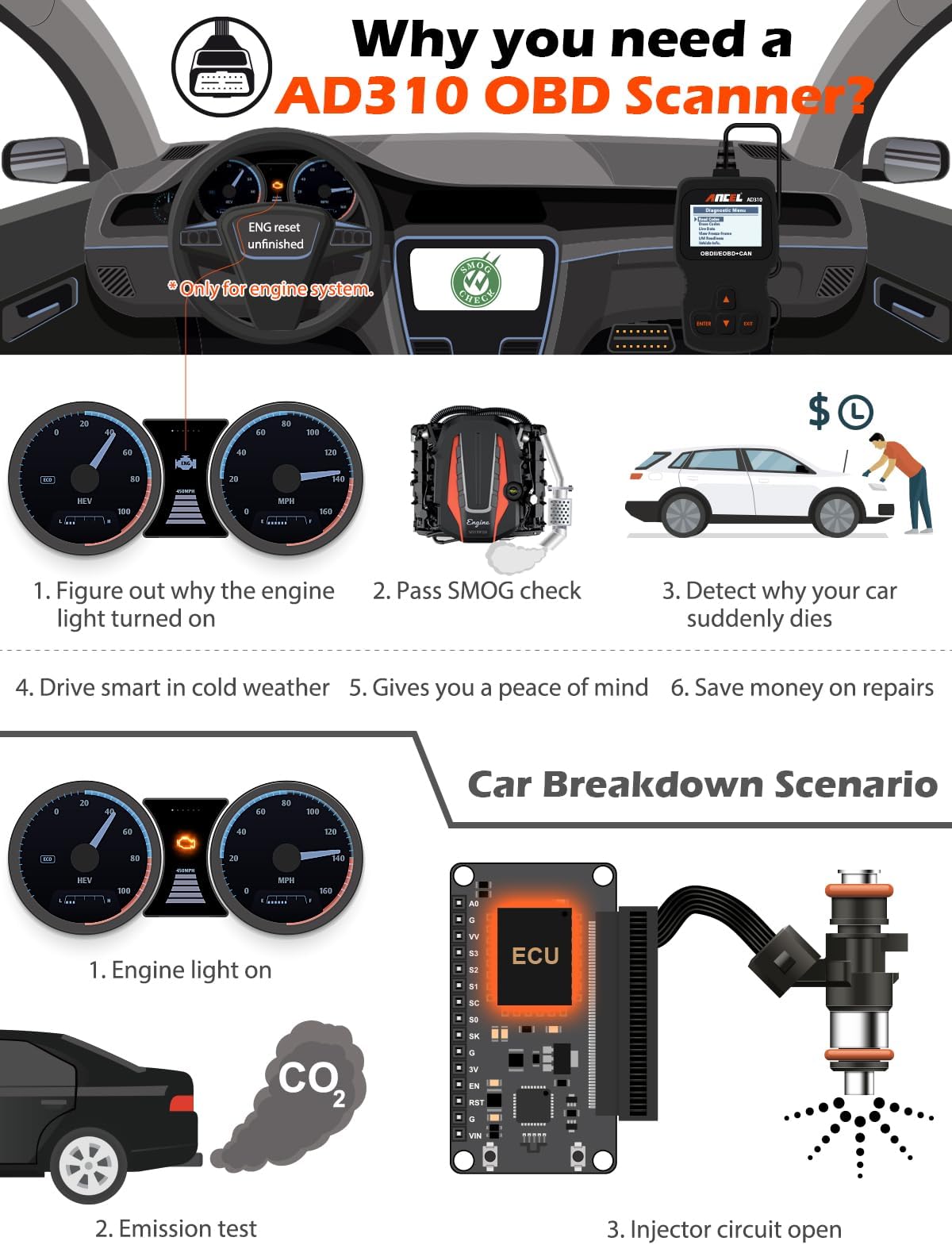 - פרוטוקולי OBDII ותאימות לרכב: כלי סריקה זולים רבים אינם תומכים בכל פרוטוקולי OBD2. סורק AD310 כיוון שהוא יכול לתמוך בכל פרוטוקולי OBDII כגון KWP2000, J1850 VPW, ISO9141, J1850 PWM ו-CAN. למכשיר זה יש גם תאימות נרחבת לרכבים עם מכוניות, משאיות קלות, רכבי שטח משנת 1996 אמריקאיות, מכוניות משנת 2000 מהאיחוד האירופי ומאסייתיות, כמו גם כלי רכב OBD2 ו-CAN חדשים יותר, מקומיים וזרים. אנא אשרו עם שירות הלקוחות שלנו האם הוא תואם לרכב שלכם לפני הרכישה.