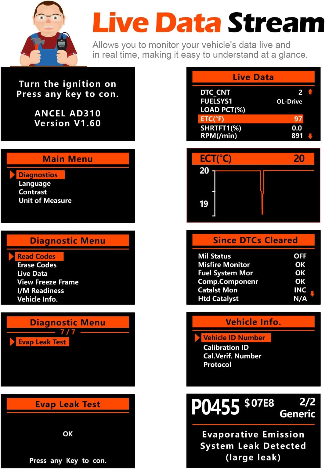 - דוקטור CEL: ה-ANCEL AD310 הוא אחד מסורקי ה-OBD II הנמכרים ביותר בשוק והוא מומלץ על ידי סקוטי קילמר, יוטיובר ומכונאי רכב. הוא יכול לקבוע בקלות את הגורם לדלקת נורית Check Engine. לאחר תיקון בעיות הרכב, הוא יכול לקרוא ולנקות במהירות קודי תקלה של מערכת הפליטה, לקרוא נתונים בזמן אמת ונתוני זיכרון קשיח, לצפות במסגרת הקפאה, מוכנות לניטור I/M ולאסוף מידע על הרכב.