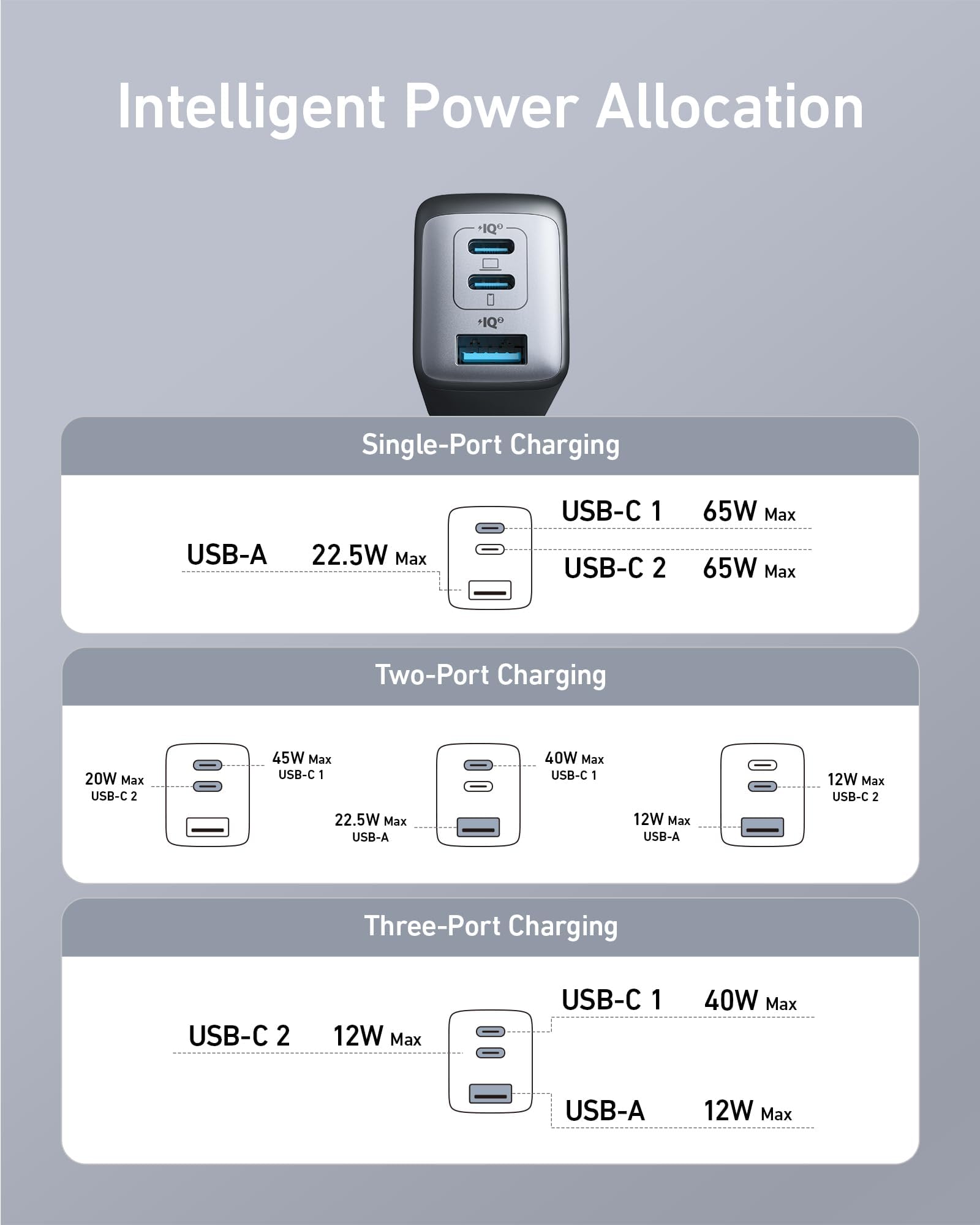 - טעינה במהירות גבוהה: חברו מכשיר יחיד לקבלת טעינה מקסימלית של 65W - זה מספיק כדי להפעיל MacBook Pro 13 אינץ' משנת 2020 במהירות מלאה. וכאשר תחברו שלושה מכשירים, החשמל יחולק ביעילות בין היציאות כדי להבטיח שתקבלו את הטעינה הטובה ביותר.
