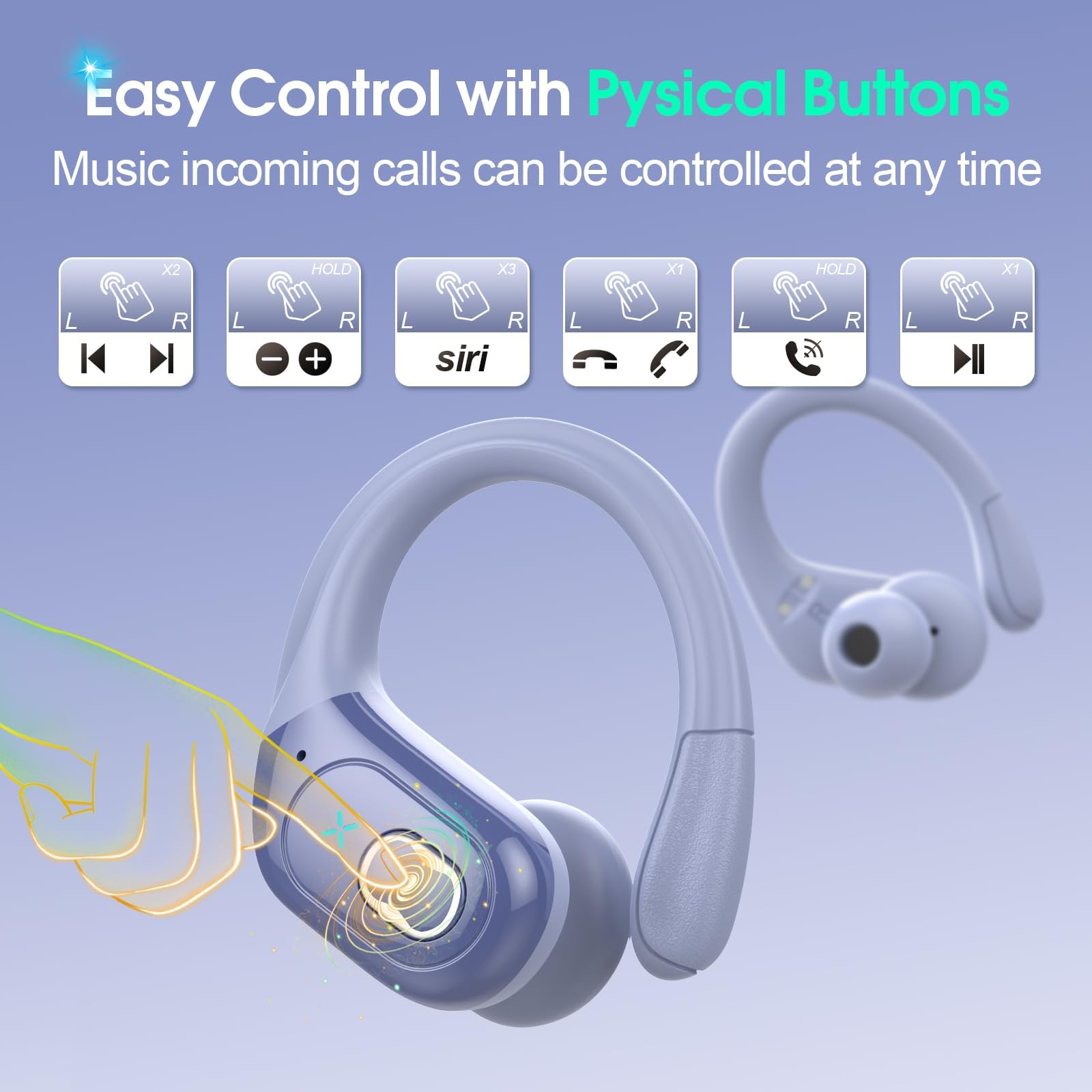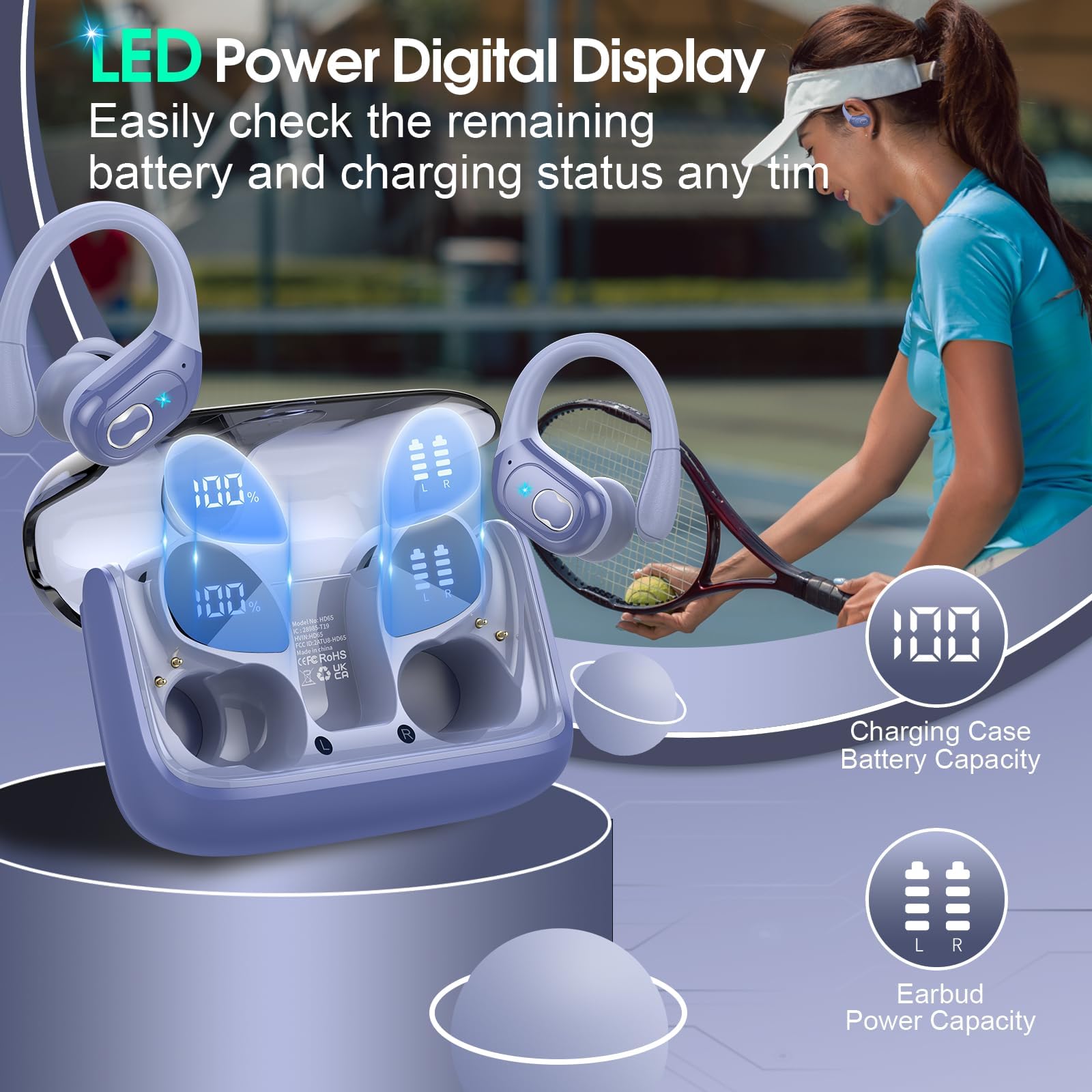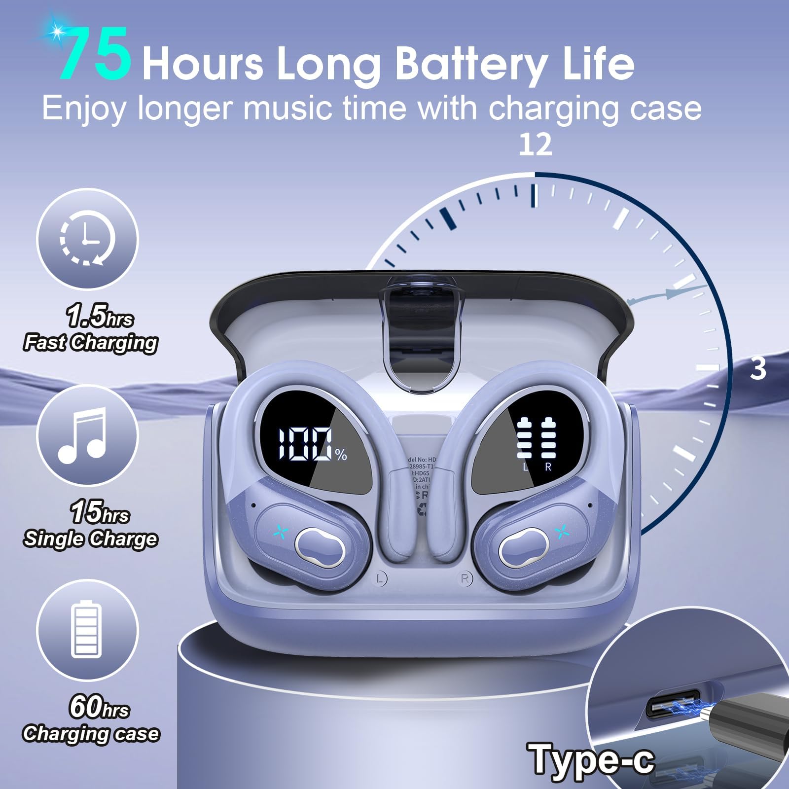 אוזניות אלחוטיות Aptkdoe 75 שעות Bluetooth 5.4 אוזניות ספורט, אוזניות Bluetooth 2025 סטריאו עם בס עמוק ווקס, מיקרופון מבטל רעשים ENC, אוזניות עמידות למים IPX7, כחול סגול