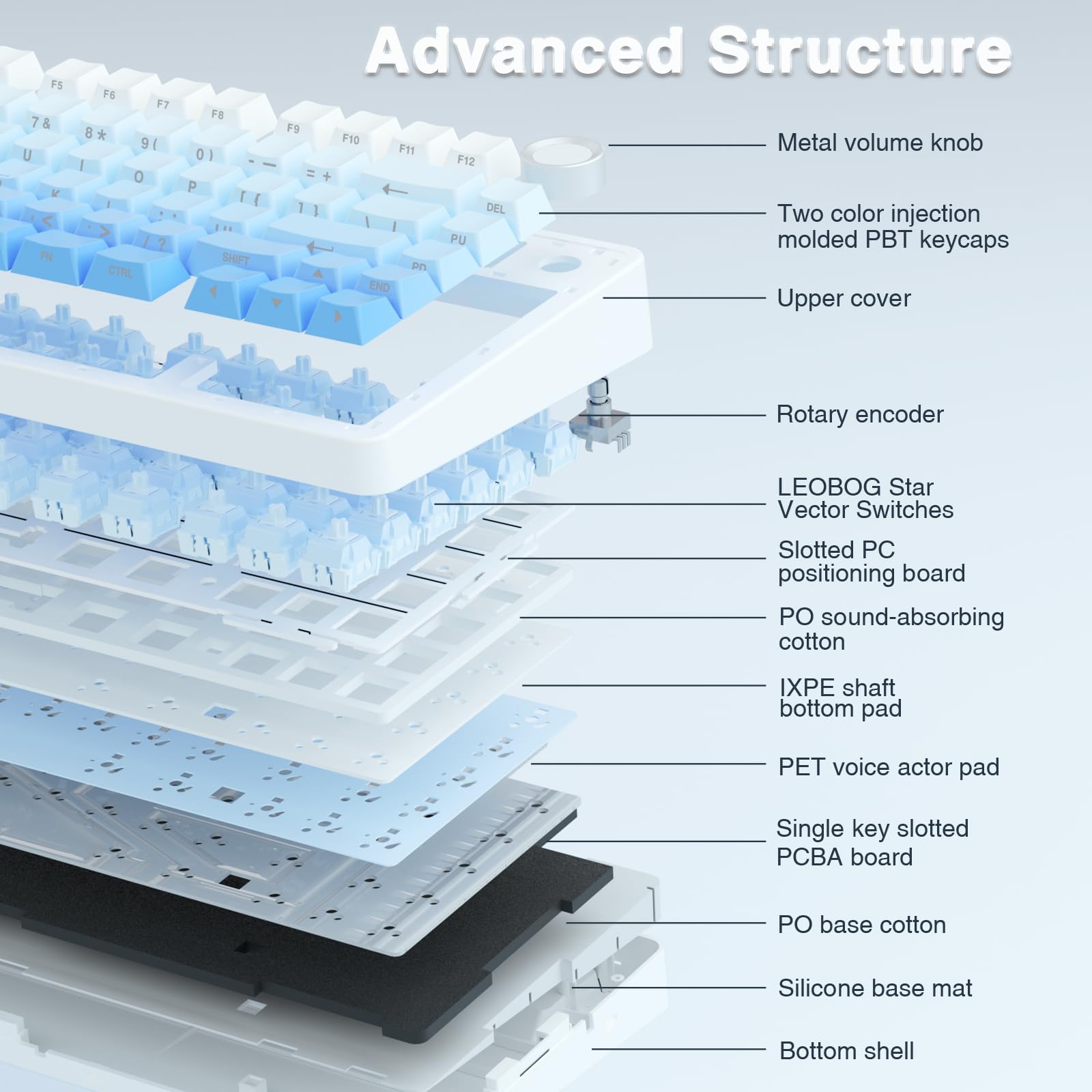 - מקלדת מותאמת אישית עם אפשרות החלפה חמה: מקלדת מכנית מותאמת אישית זו עם בסיס הניתן להחלפה חמה תומכת בהחלפת מתגים בעלי 3 או 5 פינים. אפילו מתחילים בשימוש במקלדות יכולים בקלות להכין את המקלדות שלהם בעצמם ללא בעיות הלחמה. מקלדות הגיימינג F75 Pro מצוידות במייצבים משומנים מראש ובמתגי וקטור כוכבים של LEOBOG, מעניקות תחושת הקלדה חלקה וצליל מכני נעים וקרמי, ומספקות תגובה מהירה למשחק מרגש.