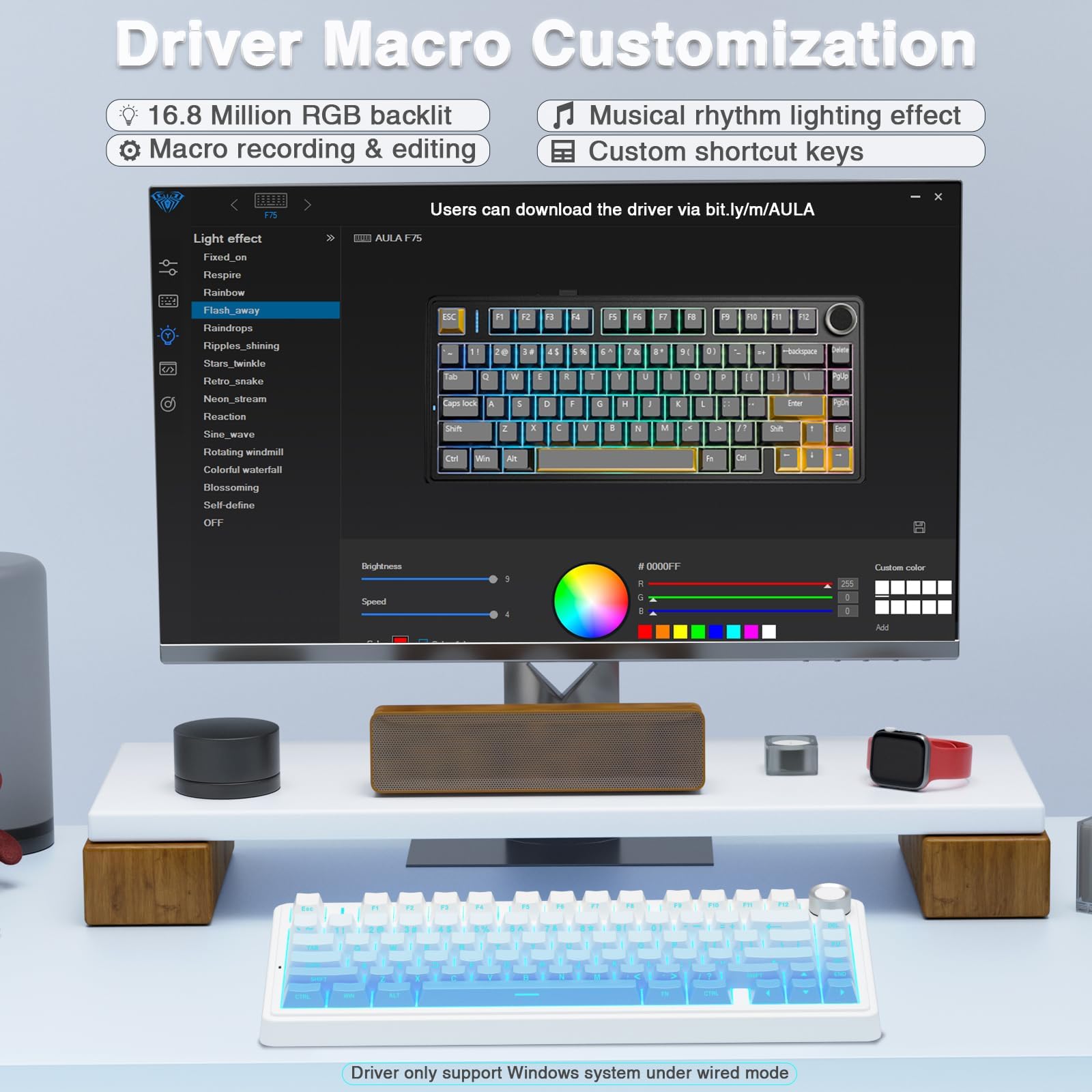 - 16.8 מיליון צבעי RGB: מקלדת ה-LED המוארת F75 Pro כוללת 16.8 מיליון צבעי RGB. עם 16 אפקטים של תאורה מוגדרים מראש להוספת אווירה נהדרת למשחק. ותומכת ב-10 אפקטים של תאורה בקצב מוזיקלי מגניב עם דרייבר. ניתן לכוונן את בהירות ומהירות התאורה באמצעות הכפתור או שילוב המקשים FN +. ניתן לבחור אפקט בצבע יחיד כרצונכם. וניתן לכבות את התאורה האחורית אם אין צורך בכך.