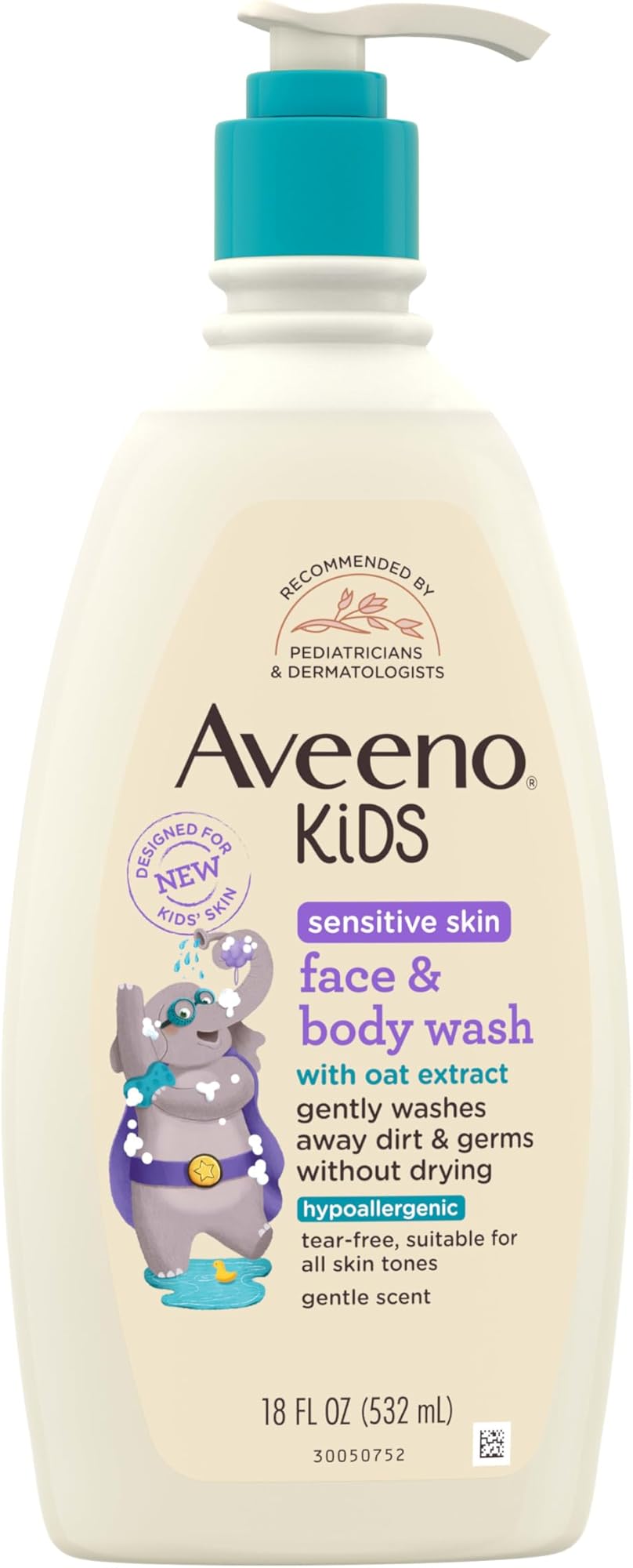 סבון פנים וגוף לילדים של Aveeno לעור רגיש, תמצית שיבולת שועל, ללא דמעות, לא מייבש, ניחוח קל, משאבה, היפואלרגני, ללא פתלטים, סולפטים וצבע, 18 אונקיות נוזל
