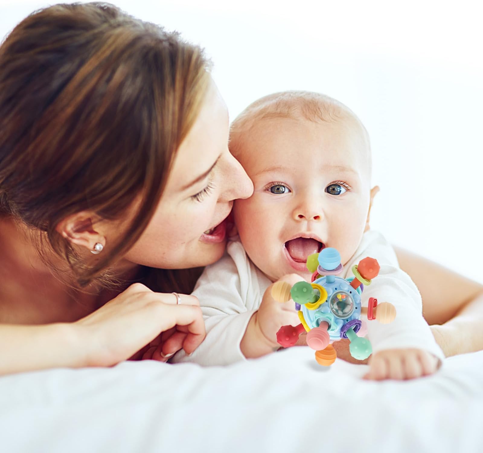- צעצוע תינוק רב חושי: צעצוע חושי זה משתמש ב-12 סוגים של צבעים בהירים וכדורי סיליקון בעלי מרקם כדי לעורר את חושיו של התינוק. טבעת הרעשן, כדור הלחיצה המסתובב והכדור המסתובב מאפשרים לתינוק ליהנות יותר מהחושים.