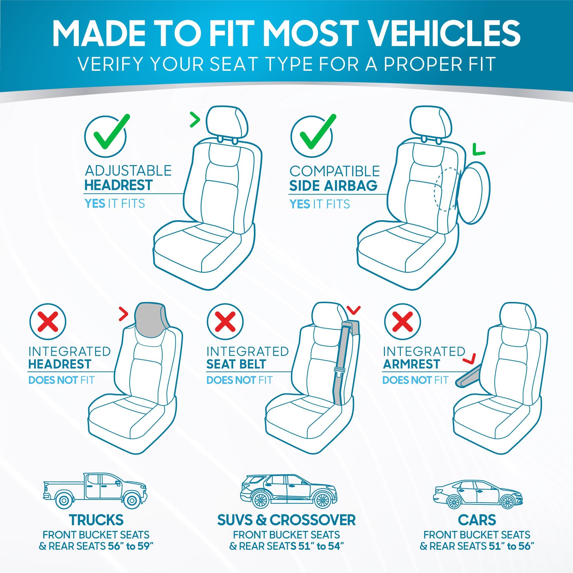 - התאמה אוניברסלית לרוב כלי הרכב: כיסויי המושבים שלנו נועדו לספק התאמה נוחה ומסוגננת לרוב המכוניות, המשאיות, הטנדרים ורכבי השטח. הם תואמים לרוב כלי הרכב הכוללים משענות ראש מתכווננות או נשלפות. שימו לב: כיסויי מושב אלה אינם תואמים למושבים בעלי משענות ראש מעוצבות (לא מתכווננות), חגורות בטיחות משולבות או משענות ידיים מובנות במושבים הקדמיים.