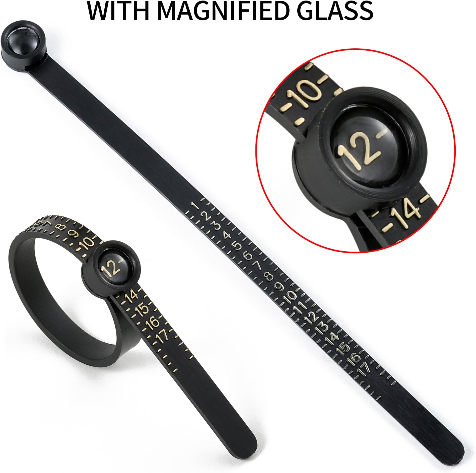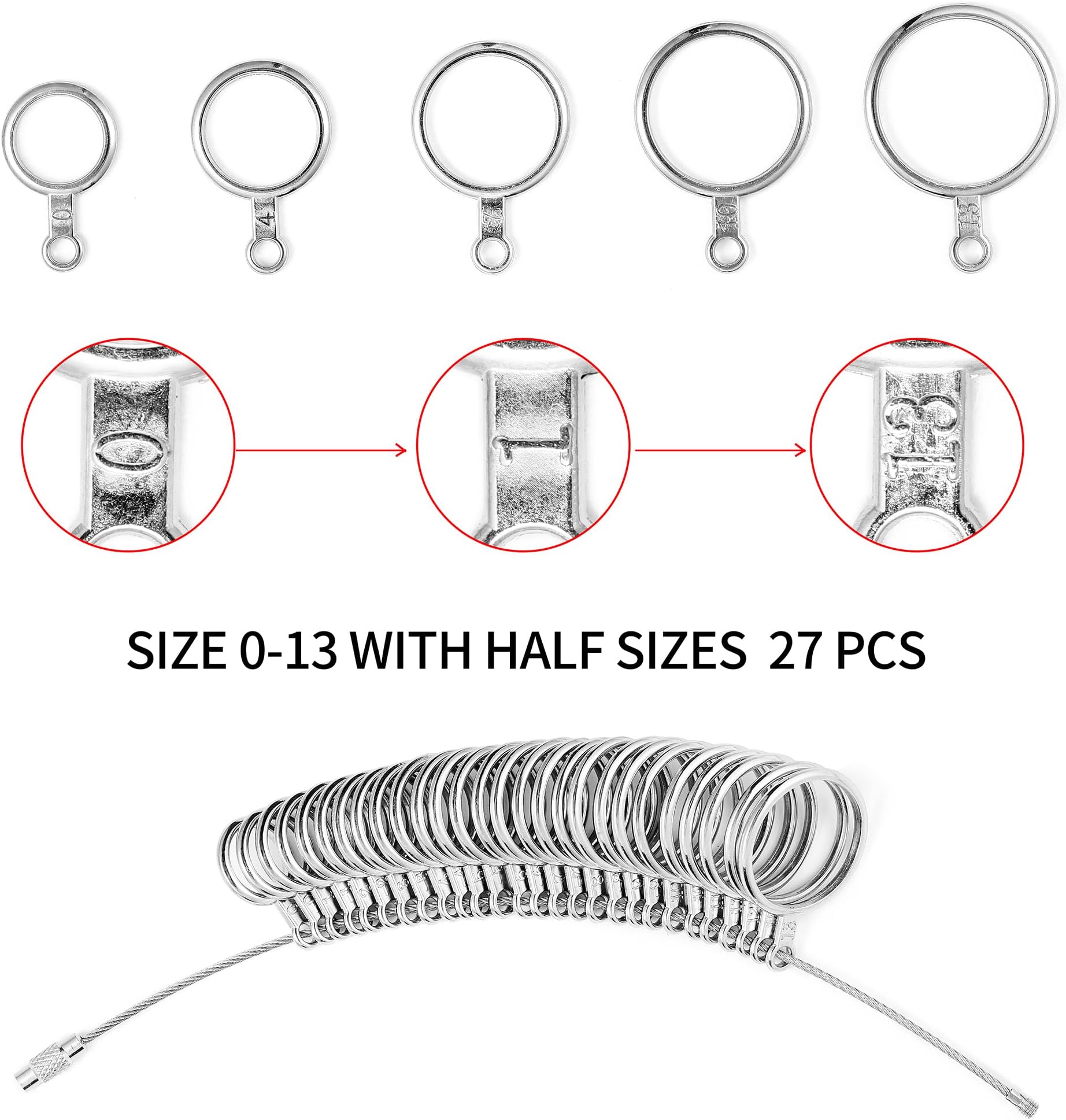 ערכת כלי מדידה של Bflaae למידת טבעות, 27 יחידות כלי מדידה מפלדת אל-חלד, גודל טבעת אמריקאי 0-13 עם חצי גודל, 2 יחידות סרט מדידה רב פעמי לאצבע עם זכוכית מגדלת 1-17 גודל טבעות אמריקאי