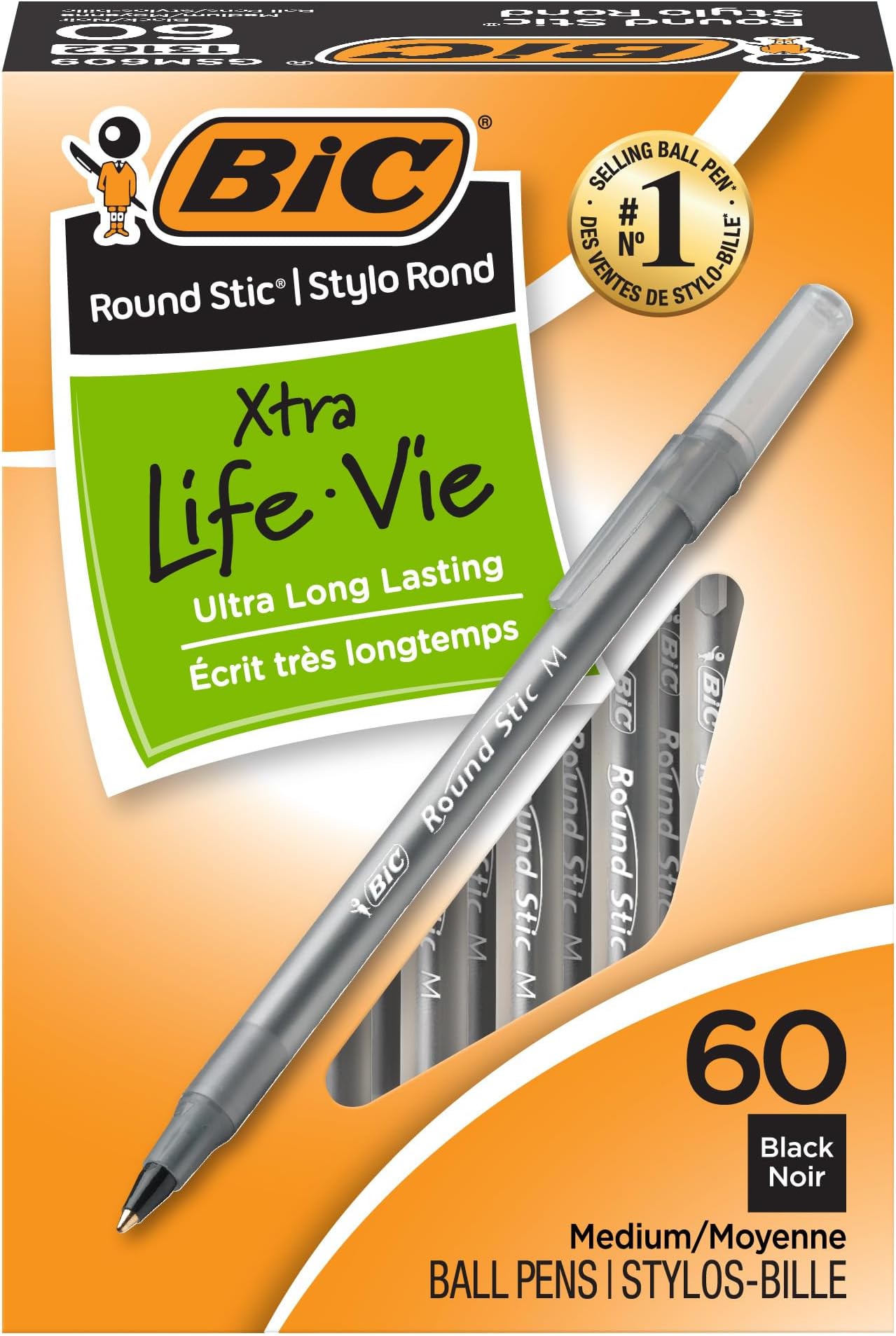 - מה כלול: חבילה של שישים (60) עטים כדוריים עגולים של BIC Xtra Life בצבע שחור