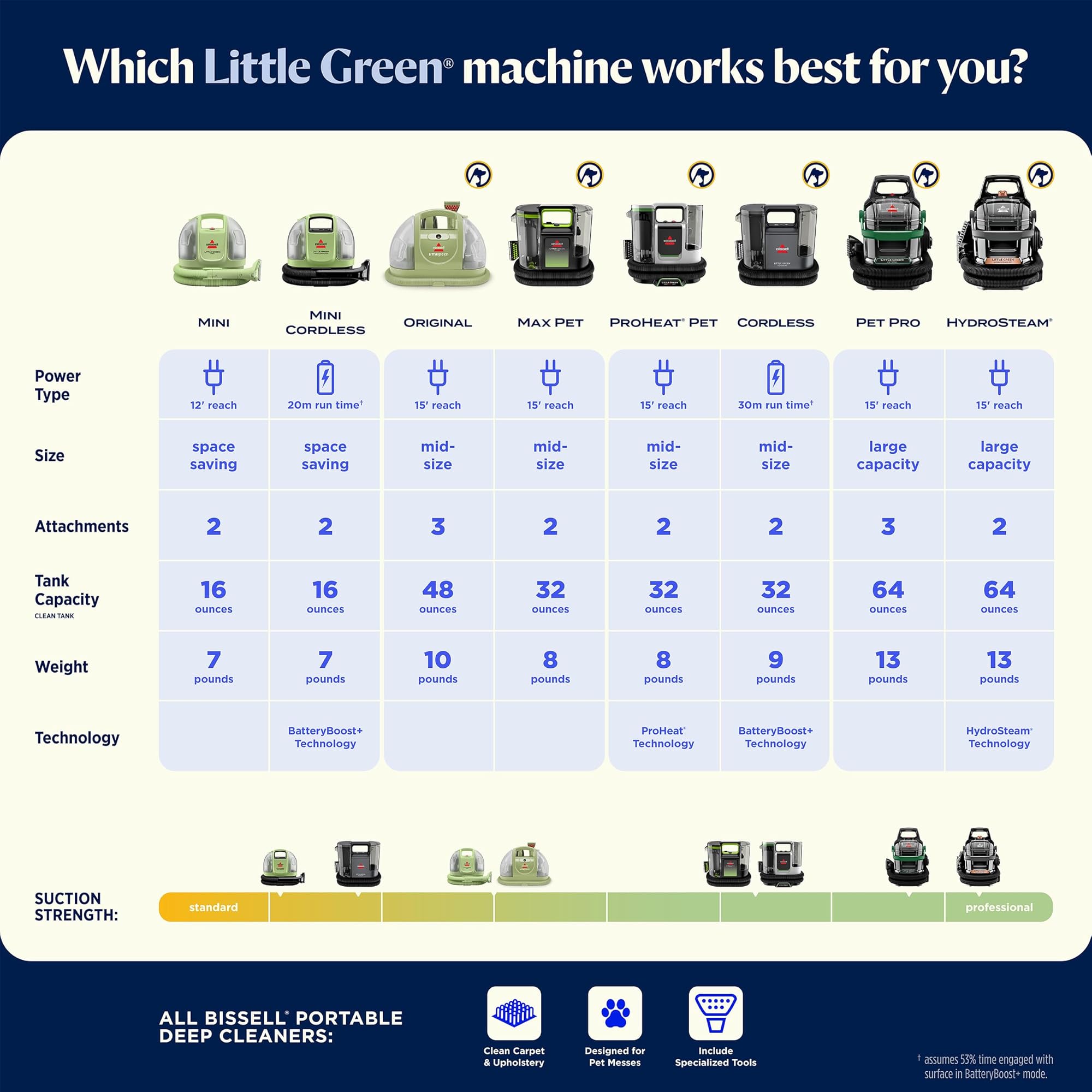 מנקה עמוק לשטיחים וריפודים נייד של BISSELL Little Green, מסיר לרכב, עם כלי ניקוי עצמי HydroRinse וכלי לניקוי כתמים קשים בגודל 4 אינץ', ירוק תה, 4075