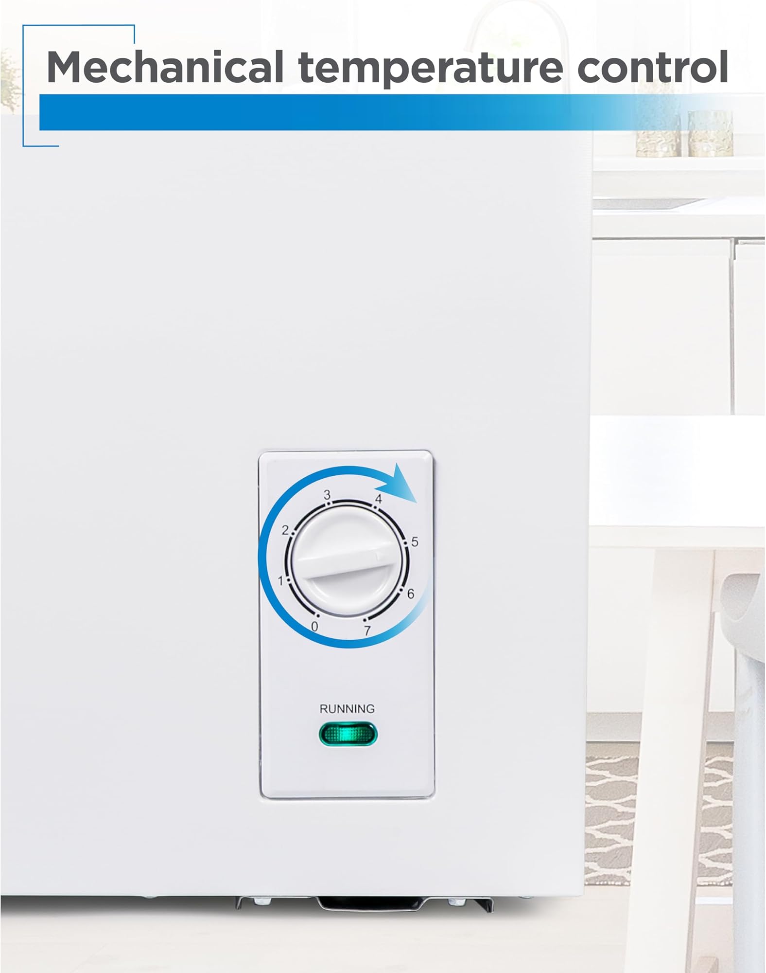 - בקרת טמפרטורה מכנית: ארגז ההקפאה כולל חוגת בקרת טמפרטורה מכנית ונורית חיווי הממוקמים בחלקו החיצוני, המאפשרים כוונון מדויק מבלי לפתוח את המקפיא.