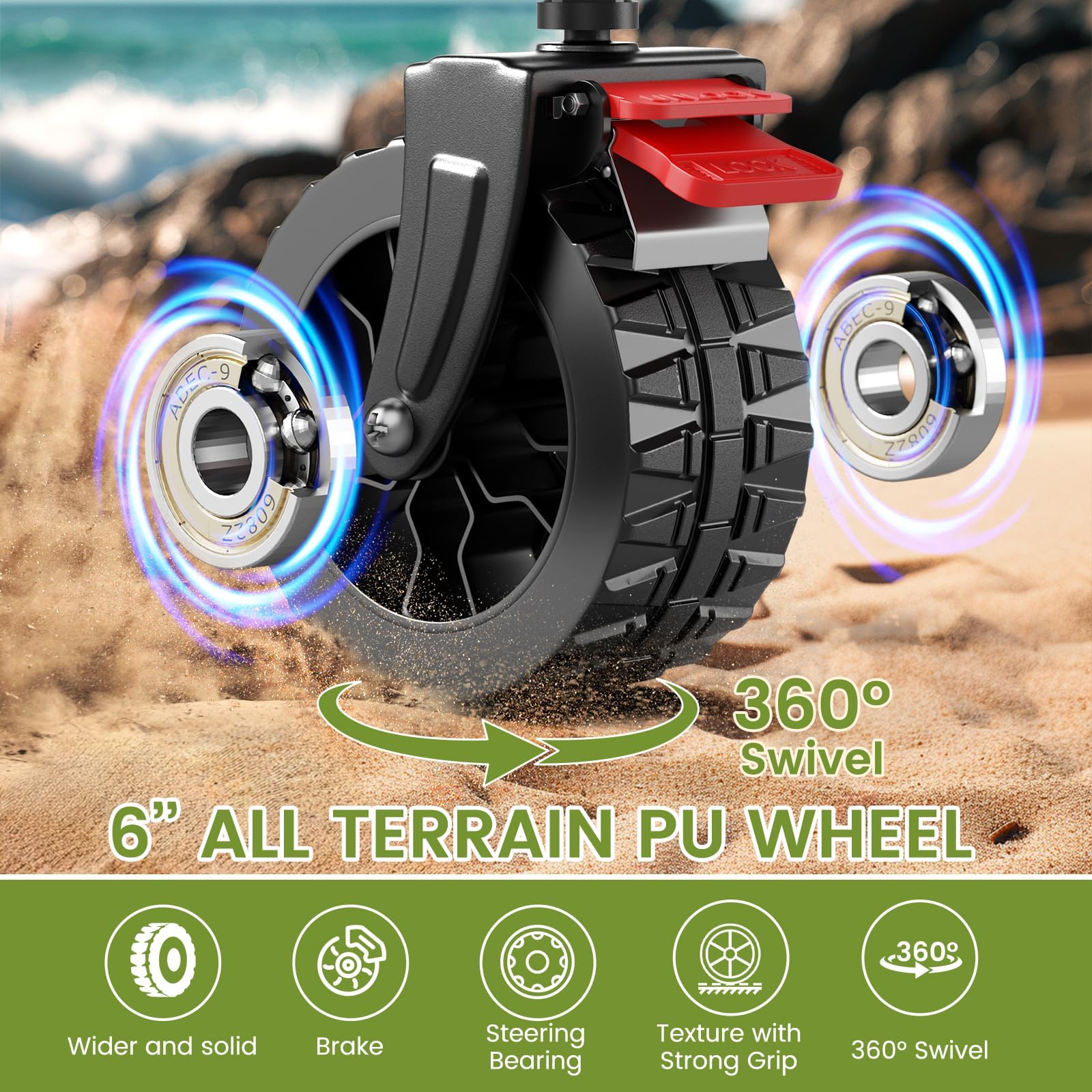 - גלגלים רחבים יותר עם בלמים: הגלגלים הרחבים בגודל 6 אינץ' יכולים להסתגל טוב יותר לכל שטח. לא משנה שאתם נמצאים על חול, בוץ, דשא או שטח אחר, עגלת העגלה המתקפלת שלנו יכולה להתמודד איתה בקלות. הגלגלים הקדמיים המסתובבים 360 מעלות מצוידים בבלמים, שיכולים לנעול את הגלגלים, למנוע מהעגלה לנוע מעצמה ולהבטיח בטיחות.