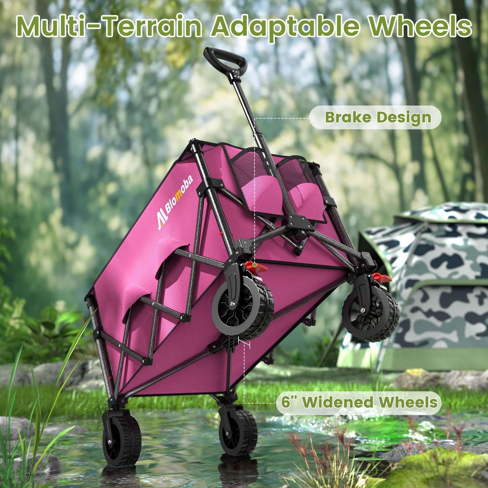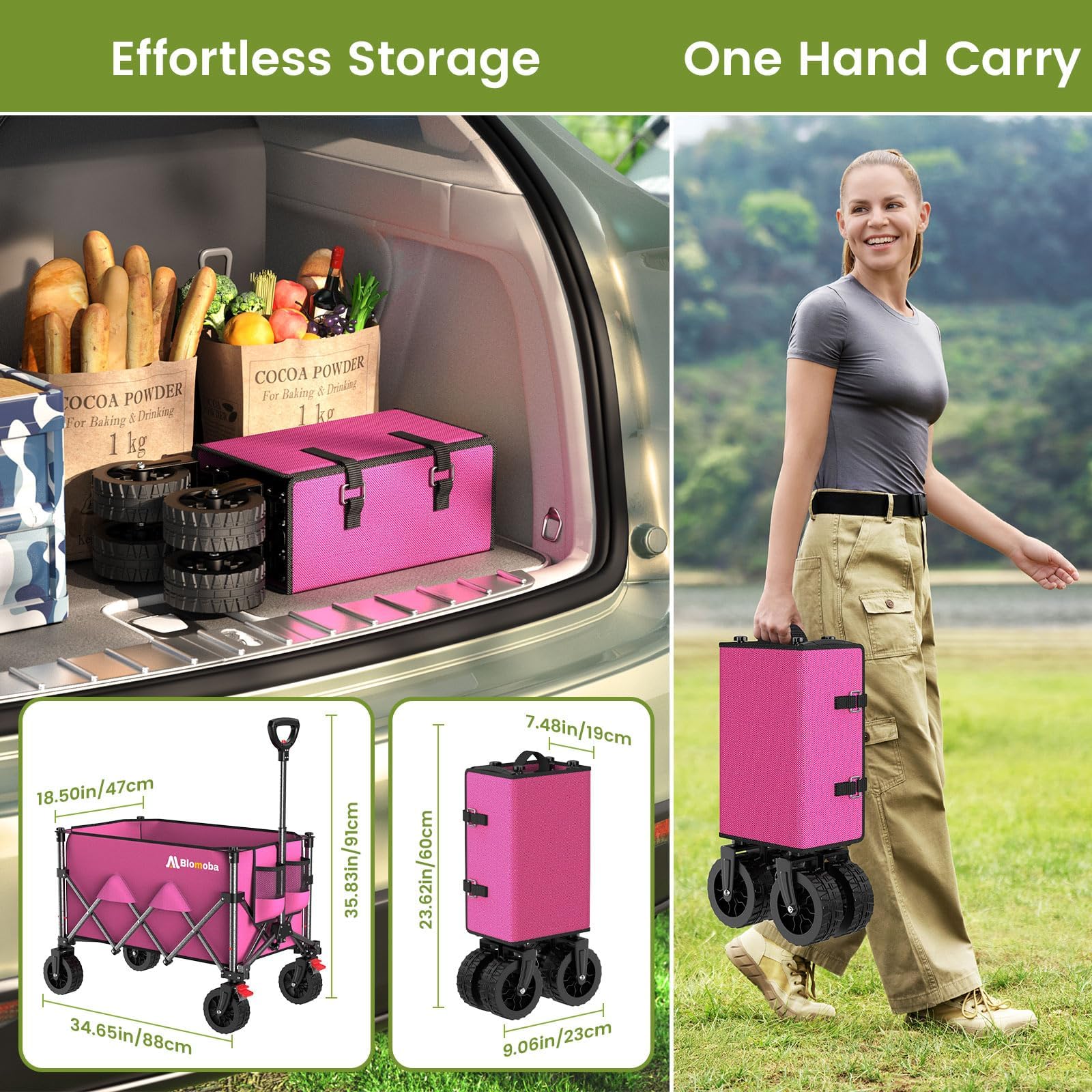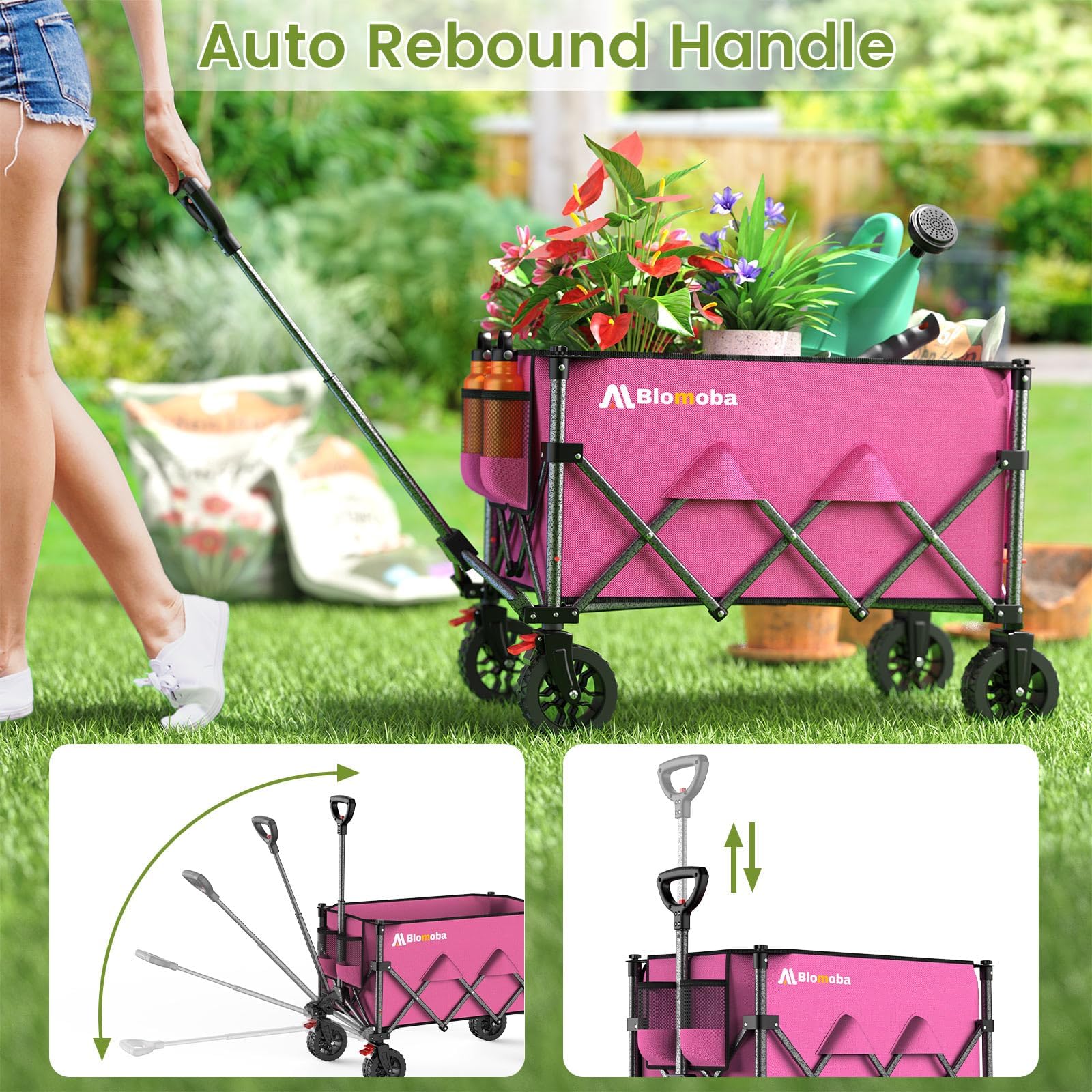 עגלת קניות מתקפלת של Blomoba, עגלת חוף מתקפלת ועמידה במשקל 150 ליטר עם גלגלים רחבים יותר וידית ריבאונד אוטומטי, עגלת קניות מכולת שימושית לגינה, קניות, קמפינג, ספורט, ורוד