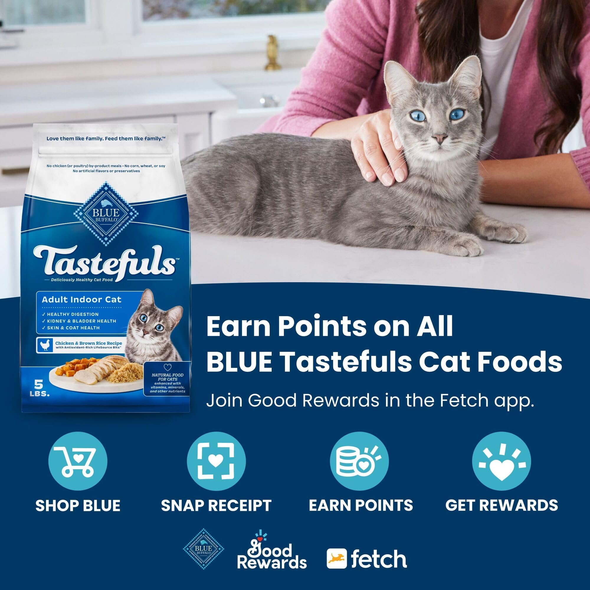 - מכיל: שקית אחת (1) של 3 פאונד של מזון יבש לחתולים בוגרים של BLUE Tastefuls, עוף ואורז חום