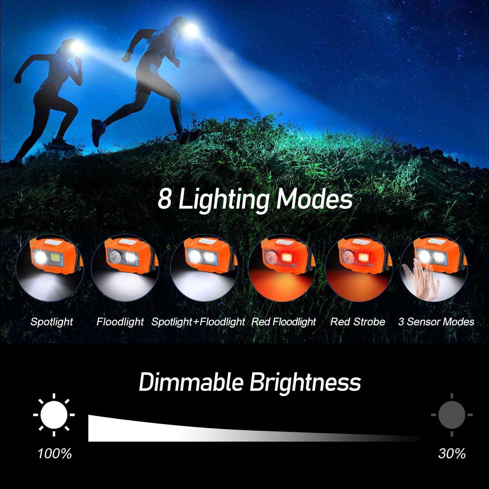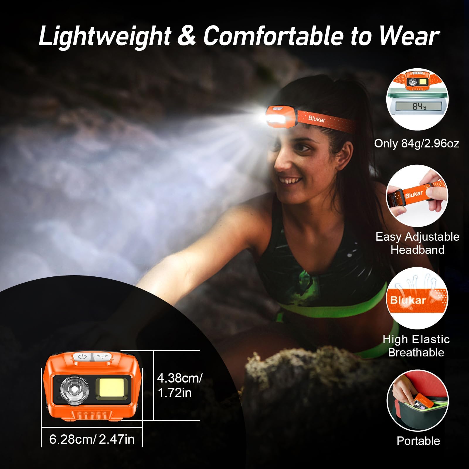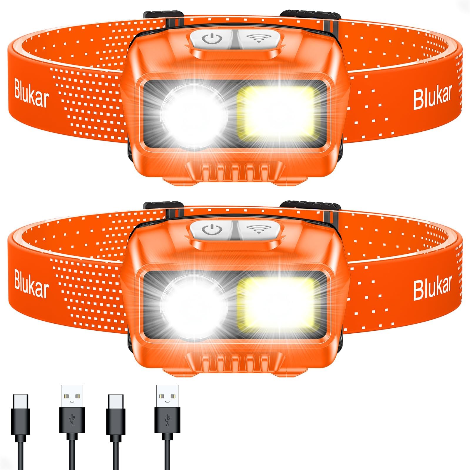 פנס ראש Blukar LED, פנס נטען בהיר במיוחד 2000 ליטר עם אור לבן ואדום, חבילה של 2 - חיישן תנועה, בהירות ניתנת לעמעום, 8 מצבים, זרקור ותאורת הצפה, עמידות למים IPX5 לקמפינג - כתום