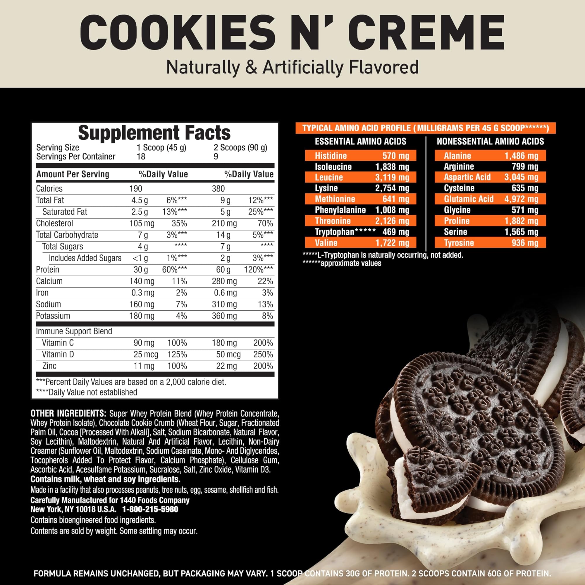 אבקת חלבון מי גבינה סופר מתקדמת של Body Fortress, עוגיות וקרם, 60 גרם חלבון ו-12 גרם חומצות אמינו מסועפות (BCAA) לכל 2 כפות מדידה, עלייה והתאוששות שרירים, תמיכה חיסונית עם ויטמינים C ו-D, 1.78 פאונד (האריזה עשויה להשתנות)