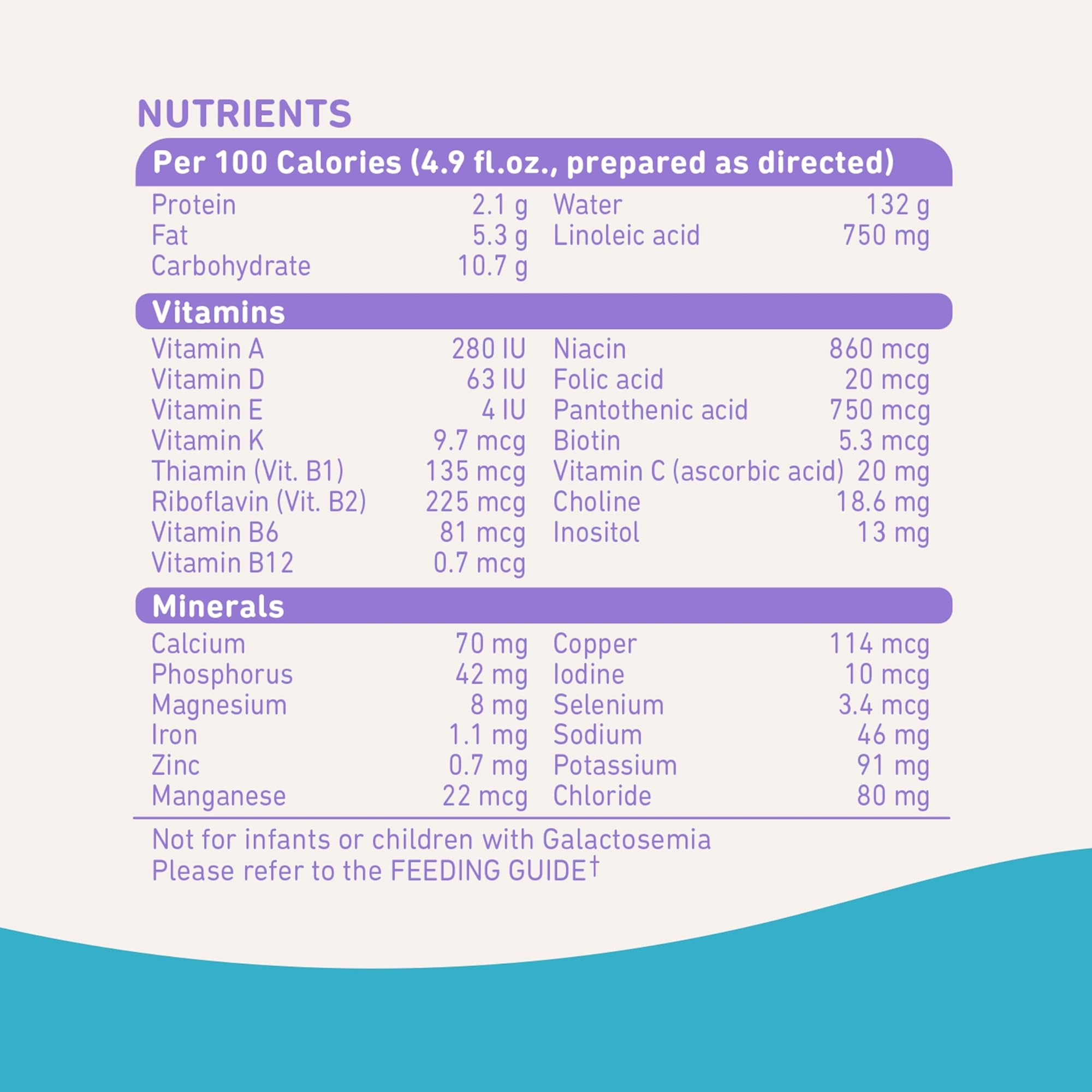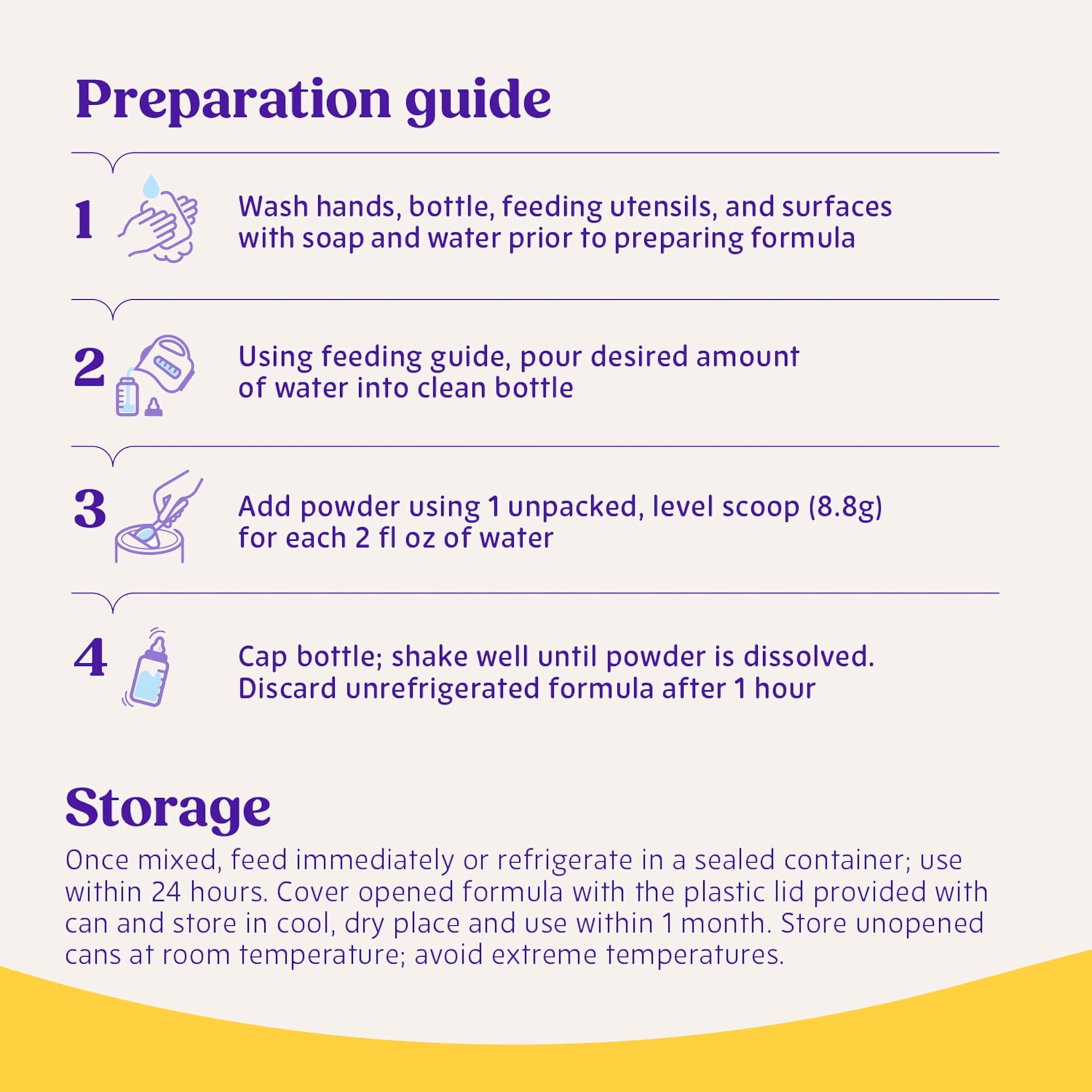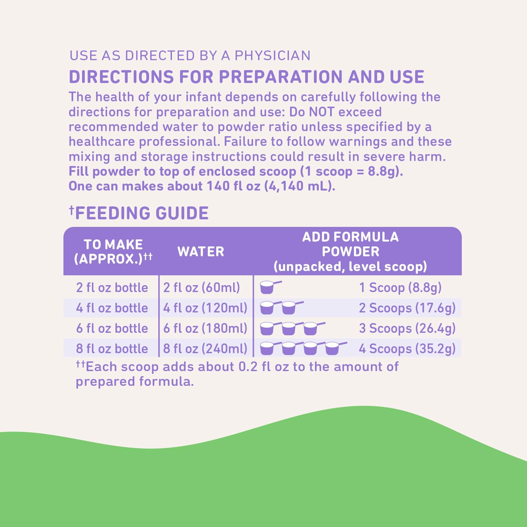 - הוראות הכנה: יש לשטוף ידיים, בקבוק, כלי האכלה ומשטחים במים וסבון. יש להוסיף אבקה באמצעות כף מדידה שטוחה אחת, לא ארוזה, לכל 60 מ"ל מים. יש לסגור את הבקבוק ולנער היטב עד להמסת האבקה. יש להשליך את הפורמולה שלא קררה לאחר שעה.