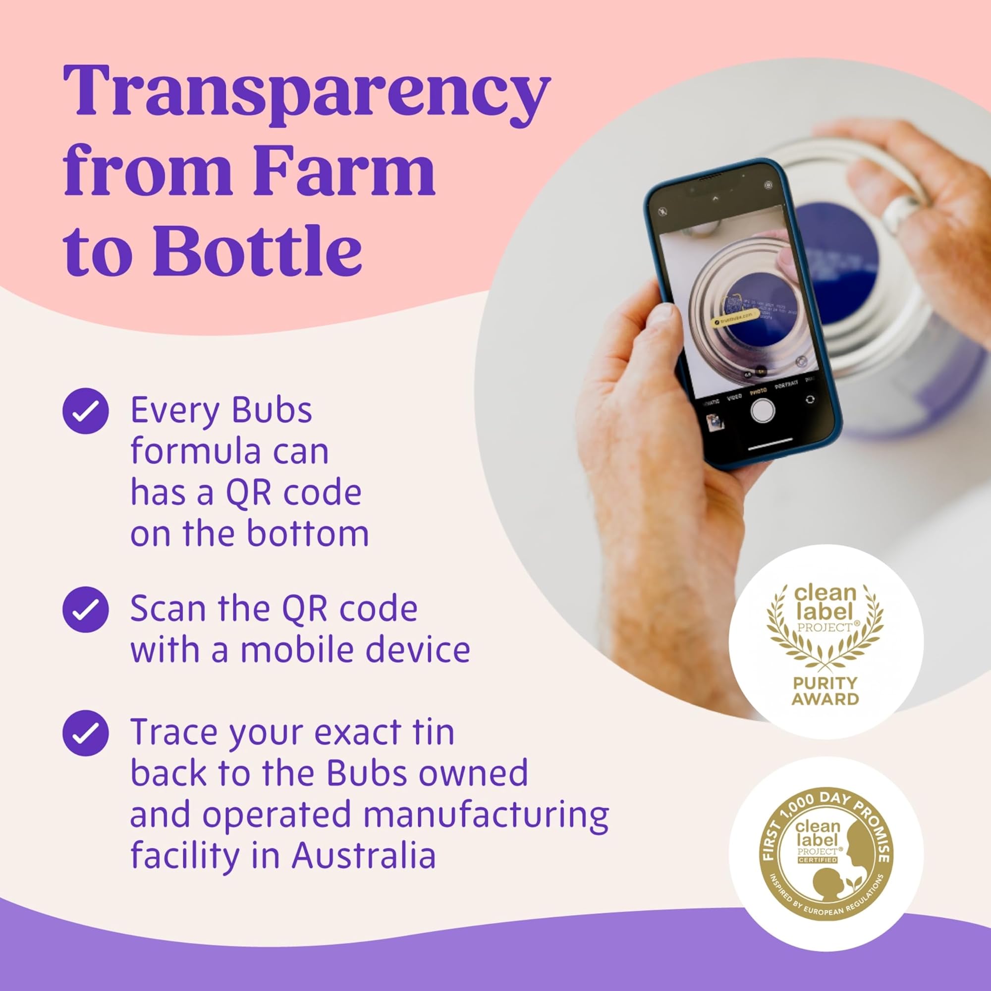 כל אחד מהחקלאים שלנו נבחר בקפידה כדי לעמוד בפרוטוקולי בקרת איכות ושקיפות מחמירים. מתקני הייצור של Bubs עומדים בכל דרישות בקרת האיכות הרגולטוריות של המדינה והפדרליות באוסטרליה ובדרישות בקרת האיכות לייצוא. מוצרי הפורמולה של Bubs מיוצרים במתקן הייצור שבבעלות ובשליטה של Bubs באוסטרליה, כולל פורמולות Bubs לפעוטות, ונבדקים בקפדנות עבור פרמטרים מיקרוביולוגיים לפני אישור השחרור.
