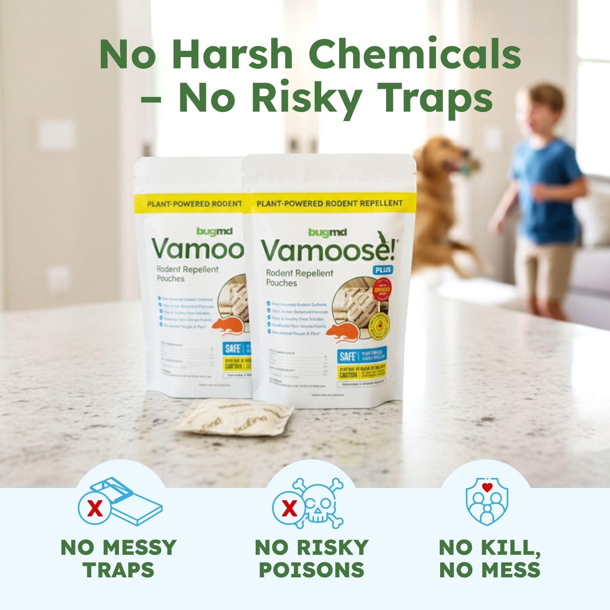 שקיות דוחה עכברים בטעם שמן מנטה של BugMD Vamoose Plus | דוחה עכברים טבעי לבית ולבית, למוסך, לקרוואן, לרכב ולאחסון | הדברת מכרסמים מבוססת צמחים - חבילה אחת - 4 שקיות