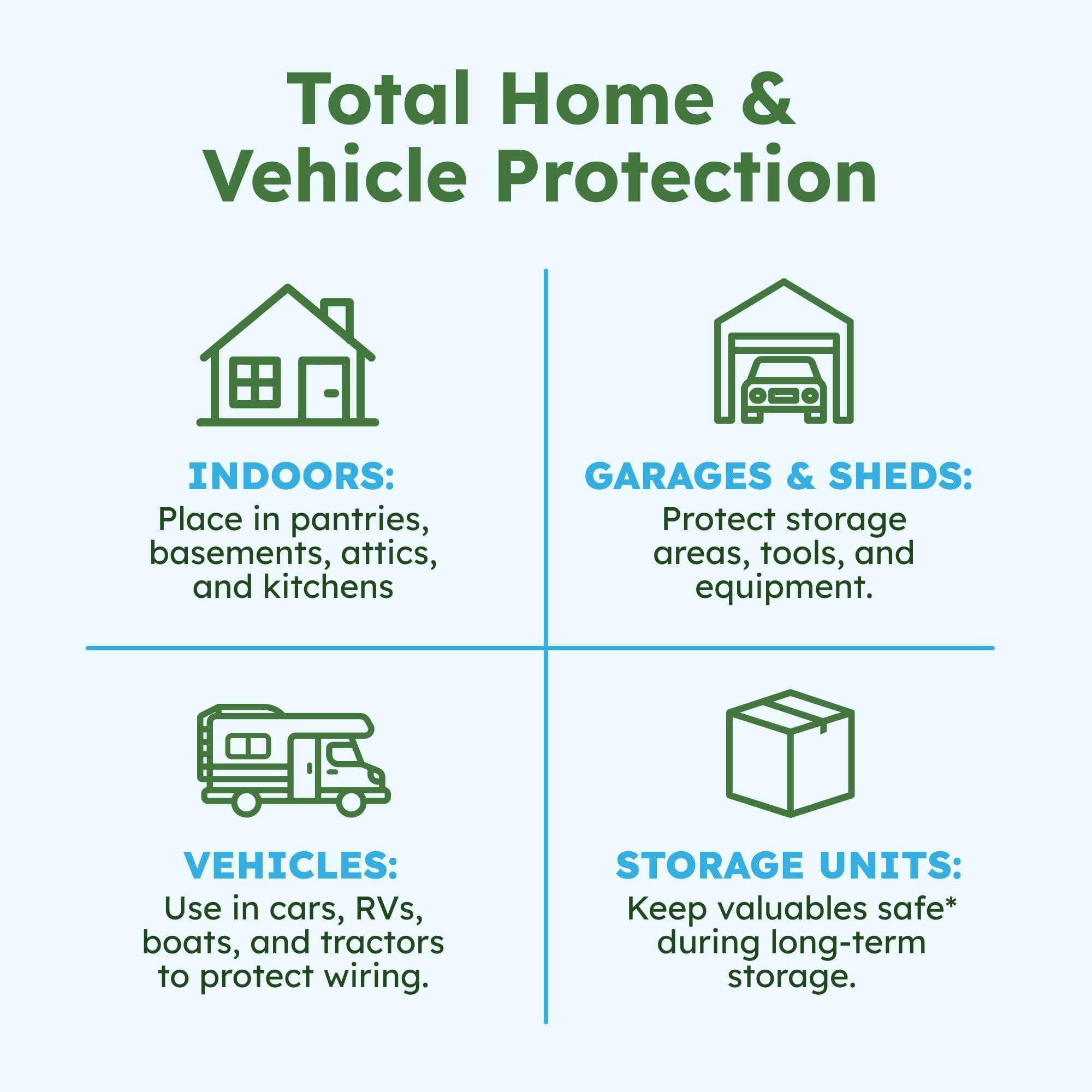 - מונע נזקי מכרסמים בכל מקום: דוחה חולדות ועכברים יעיל לרכבים (מכוניות, קרוואנים, משאיות, סירות, קרוואנים), מבנים חיצוניים (סככות, מוסכים, אסמים, יחידות אחסון) ואזורים פנימיים; מגן על מנועים, ריפודים ופריטים מאוחסנים מפני נזקי מכרסמים יקרים.