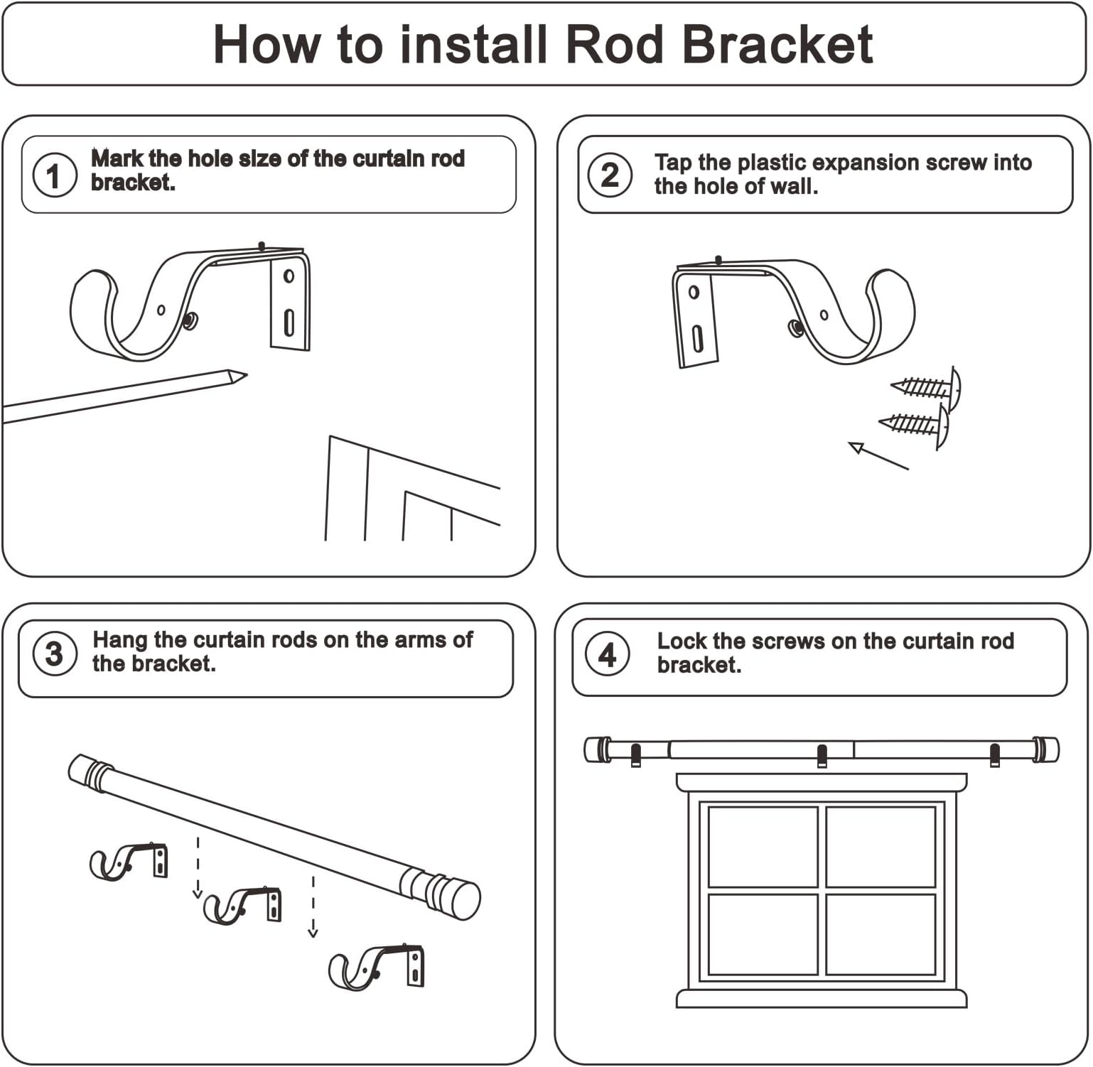 - התקנה קלה: כולל מדריך למשתמש, מוט וילון יחיד וחזק מגיע עם כל החומרה הדרושה להתקנה קלה, כולל סוגריים, ברגים, עוגני קיר גבס והוראות.