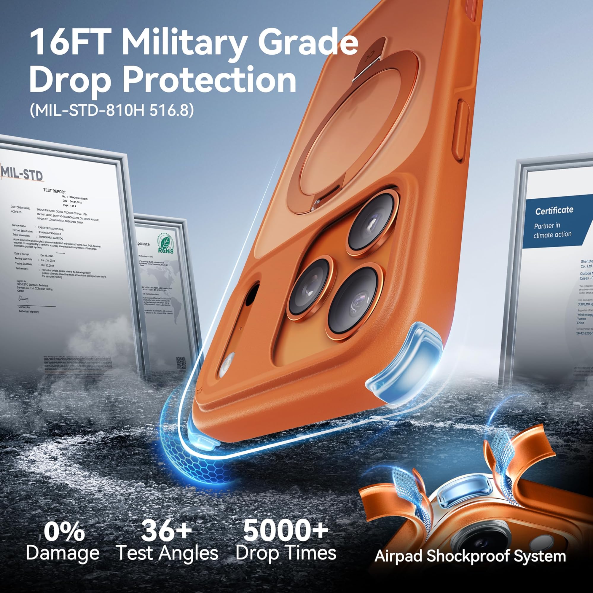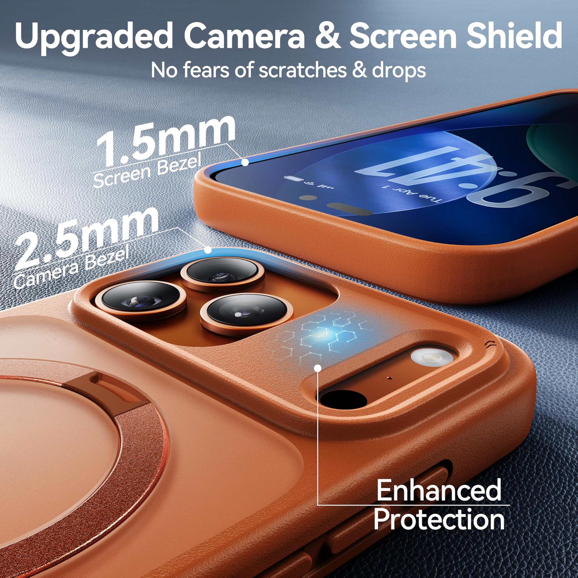 - [הגנה מקיפה של 4.7 מטר] כיסוי ה-MagicStand נבדק מעל 5,000 פעמים כנגד נפילות קיצוניות, ועמיד בהרבה מכיסויים רגילים. גב פוליקרבונט עמיד בפני זעזועים עם ריפוד AirPad מגן מפני נפילות ופגיעות יומיומיות. (MIL-STD-810H 516.8) חדש לאייפון 17 פרו מקס: מגן ייעודי משפר את ההגנה הכוללת ומשפר את עמידות המצלמה לשריטות ב-50%. יחד עם גבולות העדשה המוגבהים ב-2.5 מ"מ ומסגרת המסך בגודל 1.5 מ"מ, הטלפון שלך מקבל הגנה מקיפה.