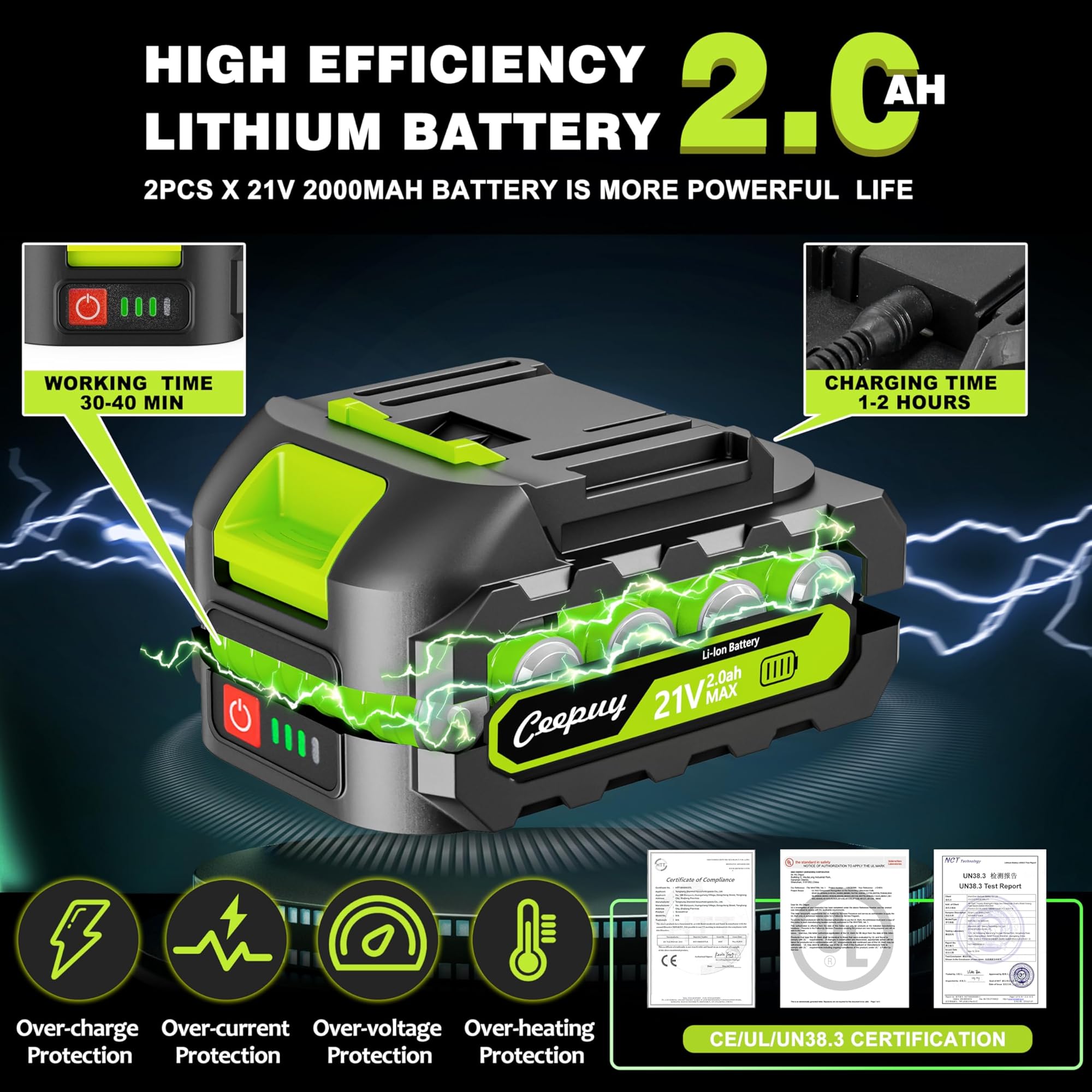 - ✔【סוללה נטענת בעלת קיבולת גדולה וחיים ארוכים】מסור השרשרת החשמלי המיני Ceepuy מצויד ב-2 סוללות ליתיום בעלות אנרגיה גבוהה 21V 2000mAh הניתנות להסרה ונטענות. טעינה מהירה של שעה וחצי מספקת עד 30-40 דקות של שימוש רציף, המסוגלות לבצע 120-150 חיתוכים בבלוקים בגודל 4x4 אינץ' או 100-120 חיתוכים בבלוקים בגודל 6x6 אינץ'. מערכת הגנת עומס יתר ומערכת בקרת הטמפרטורה של הסוללה נועדו למקסם את תוחלת החיים. ניתן לטעון אותן ולפעול ביעילות בכל עת, מה שמציע נוחות ומהירות.