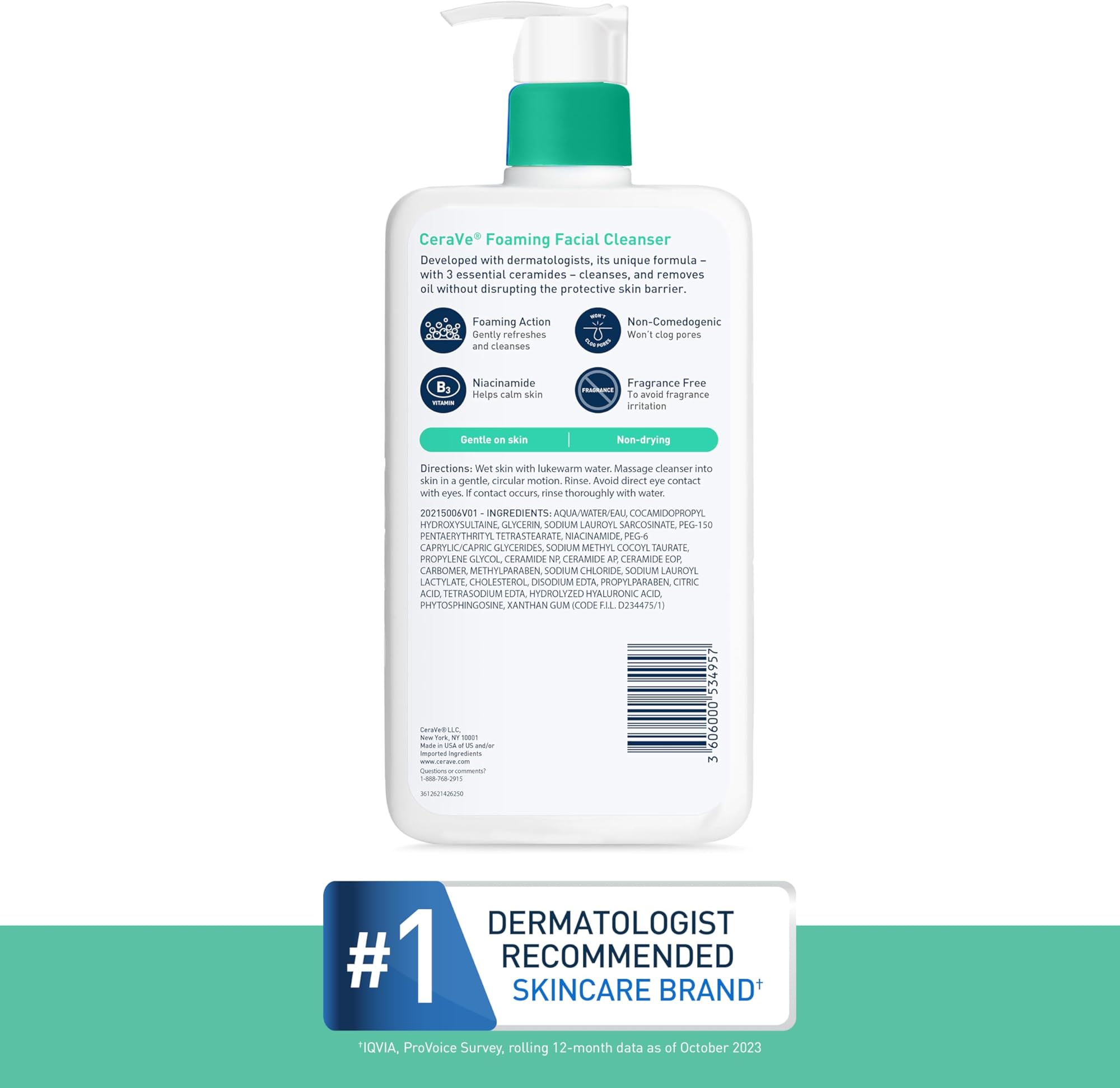 סבון פנים מקציף CeraVe, סבון פנים יומי לעור שמן, חומצה היאלורונית + סרמידים + ניאצינמיד, ללא בישום וללא פרבנים, סבון פנים לשליטה בשמנים שאינו מייבש, 19 אונקיות נוזל