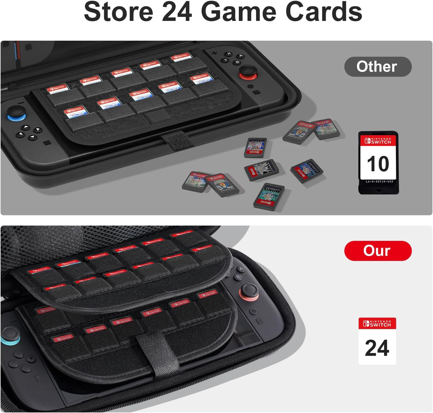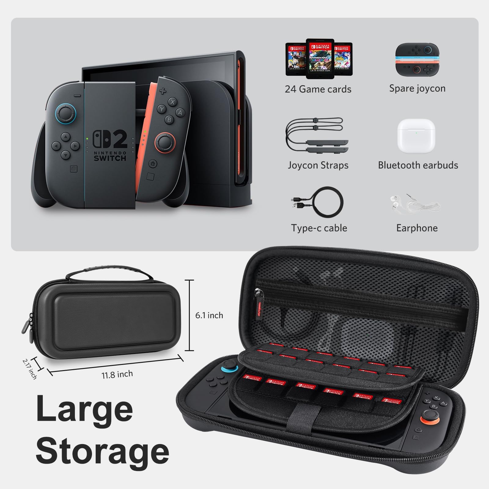 תיק נשיאה גדול CoBak עבור נינטנדו סוויץ' 2 (2025) - חבילת אביזרים 3 ב-1 עם 2 מגני מסך, כיסויי אחיזה לאגודל, 24 מחסניות משחק, נרתיק נשיאה קשיח נייד, שחור