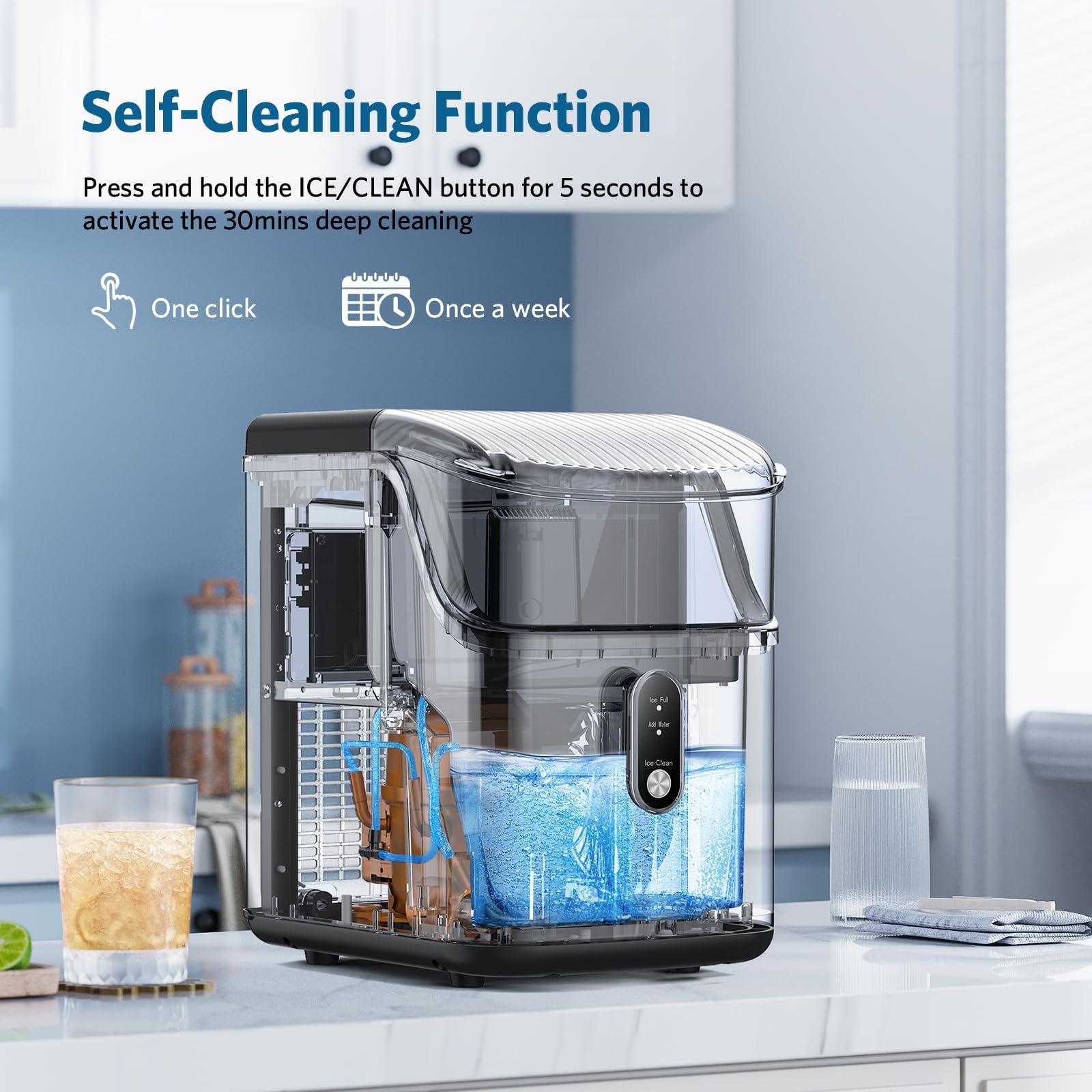 - 【ניקוי אוטומטי】למכונת הקרח יש כפתור ניקוי אוטומטי בלחיצה אחת כדי לחסוך לכם זמן נוסף. לחצו רק על כפתור "ניקוי" למשך חמש שניות, מכונת הקרח אורכת כ-15 דקות כדי להשלים את הניקוי.