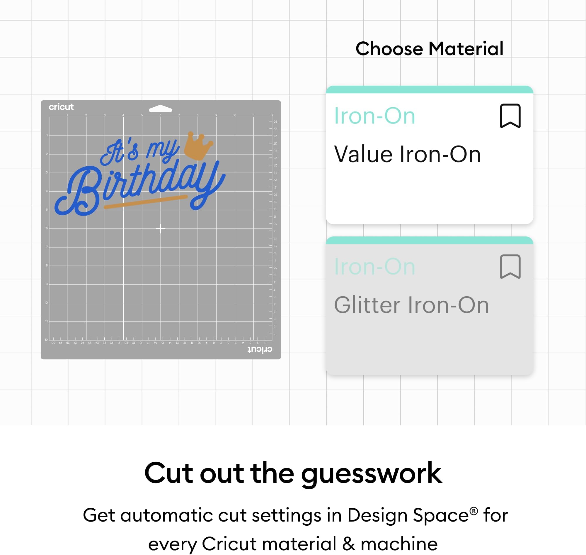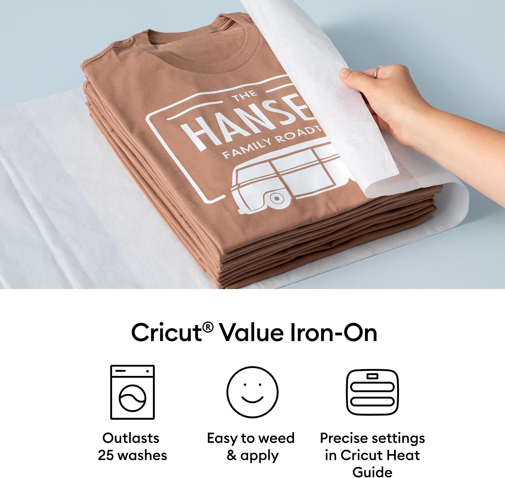 רק הוסיפו חום! עם Cricut® Value Iron-On, תוכלו להתאים אישית חולצות טריקו, מעילים, תרמילים ועוד הרבה יותר. בנוסף, מידות גדולות פירושן יותר ייצור. יש לו גם ציפוי גב שקוף ועמיד בחום לגיהוץ קל, והוא עמיד ל-25 כביסות. Cricut Value Iron-On תוכנן לתת לכם את השילוב המושלם של עלות ואיכות. על ידי מכירה במידות גדולות ואריזה פשוטה, אנו מעבירים את החיסכון אליכם. מותאם במיוחד למכונות חיתוך Cricut. הגדרות חיתוך אוטומטיות ב-Design Space® מבטיחות לכם את חוויית החיתוך הטובה ביותר עם כל חומר ומכונת Cricut.