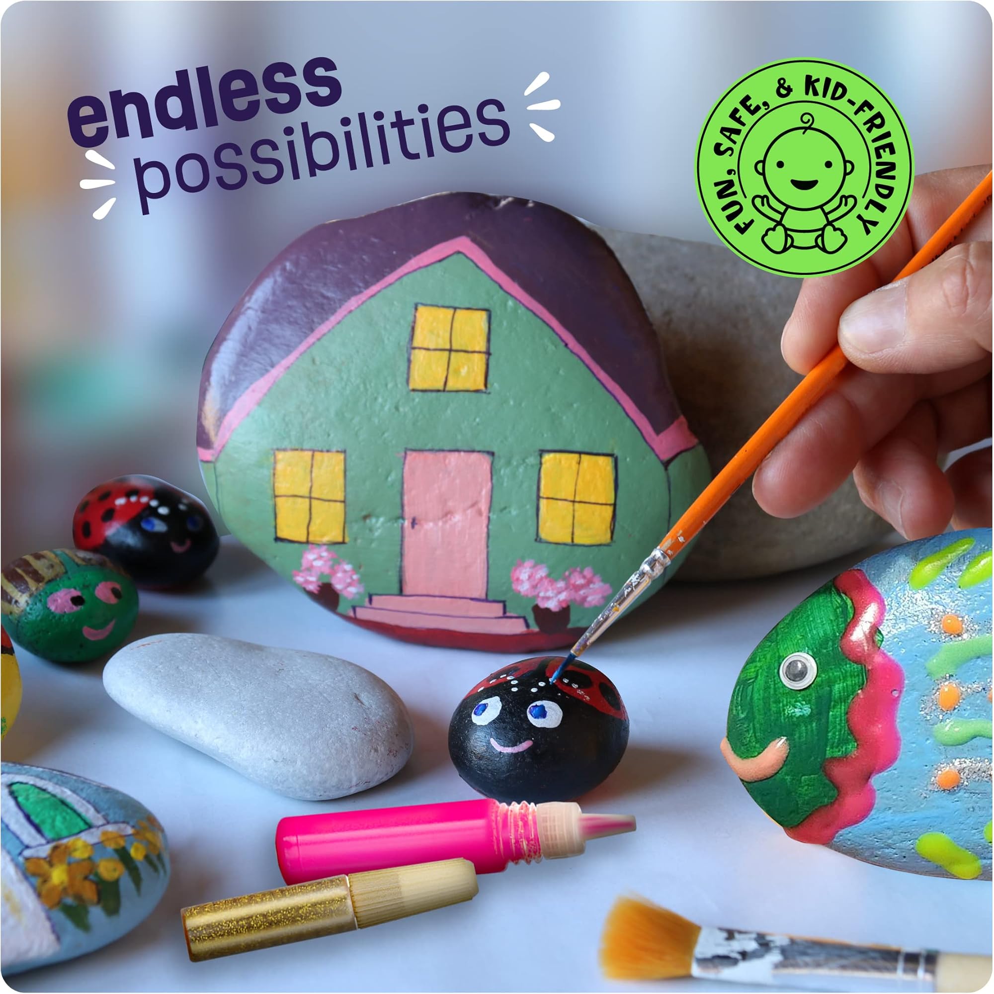 - כיף וקל: בין אם אתם מתחילים או מציירי סלעים מנוסים, ערכת צביעת הסלעים הזוהרת בחושך מציעה לכם משהו. מברשת הצבע בעלת הקצה הדק נהדרת לקווים מדויקים, בעוד שהמברשת הרחבה יותר מושלמת לאזורים גדולים יותר. בעזרת עיניים גוגלי, מדבקות אבני חן ומדבקות העברה הכלולות, ילדים יכולים להיות יצירתיים ולהוסיף את המגע האישי שלהם לסלעים שלהם.