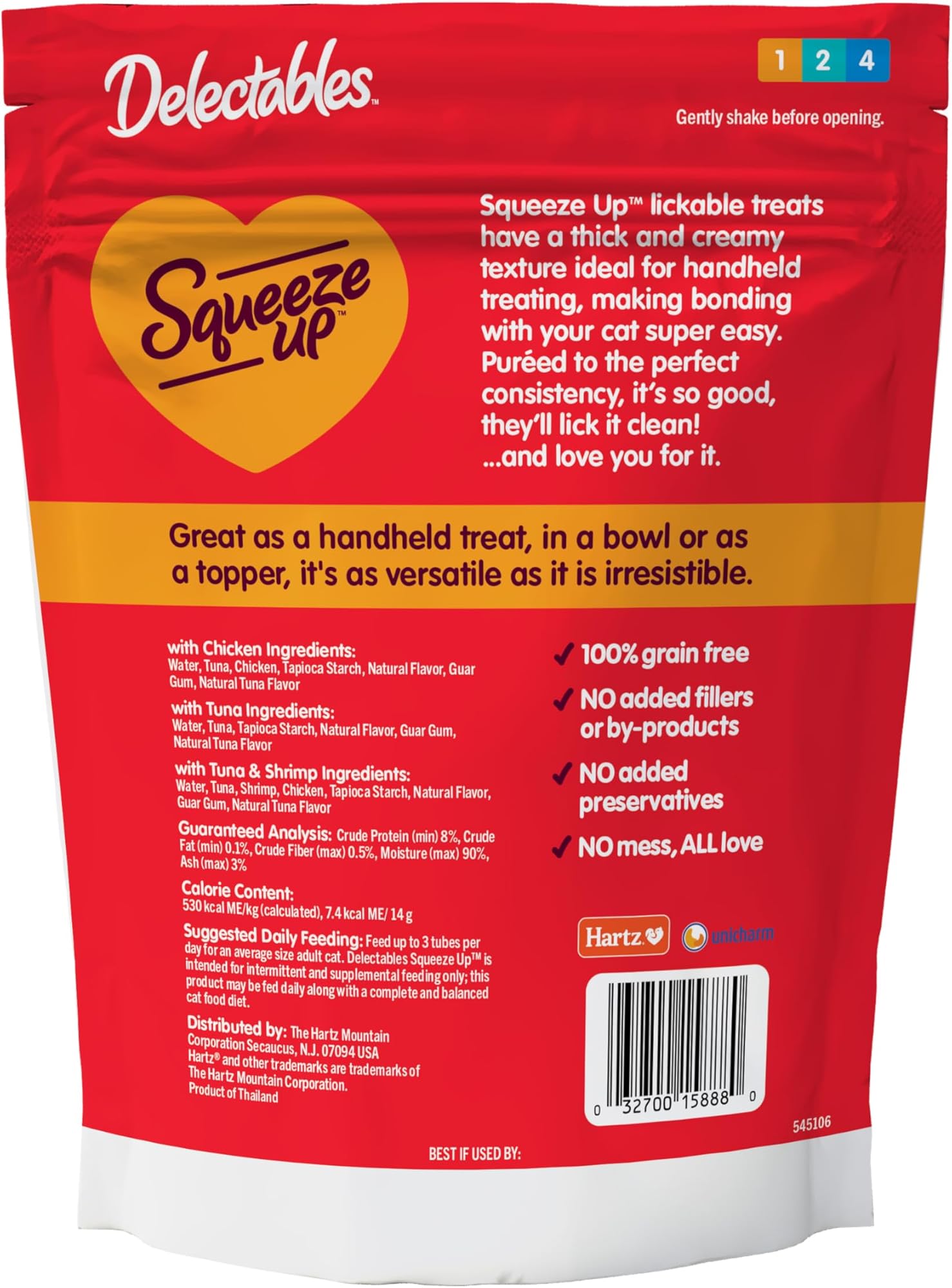 חבילת Delectables Squeeze Up מגוונת, מחית קרמית לסחיטה, חטיפים רטובים לחתולים ללקק, ללא דגנים, ללא חומרי מילוי נוספים, ללא תוצרי לוואי, ללא חומרים משמרים נוספים, שפופרת 0.5 אונקיות, 24 שפופרות בסך הכל