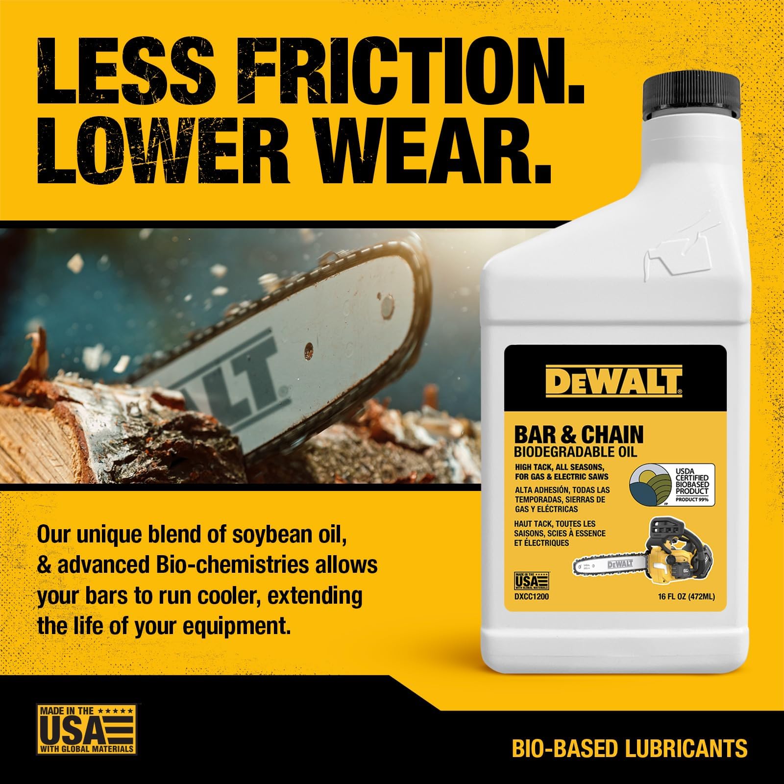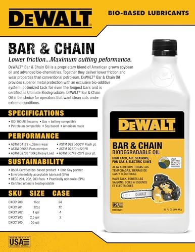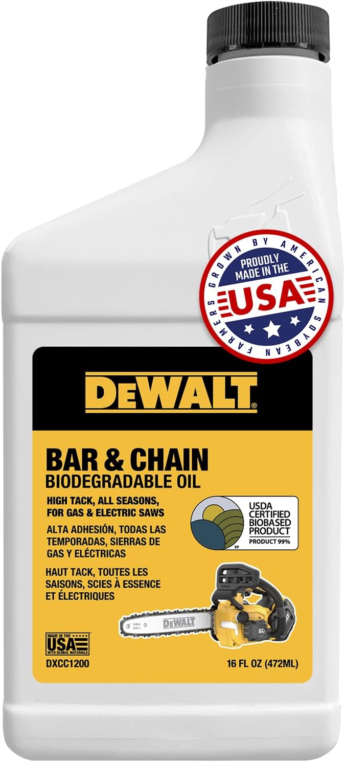 DEWALT – שמן מתכלה ביולוגית למוט ושרשרת – חומר סיכה מקצועי ירוק, ידידותי לסביבה, לא רעיל למוט ושרשרת – שמן נקי במיוחד לכל העונות למסור גז, חשמלי ומסור מוט, 16 אונקיות