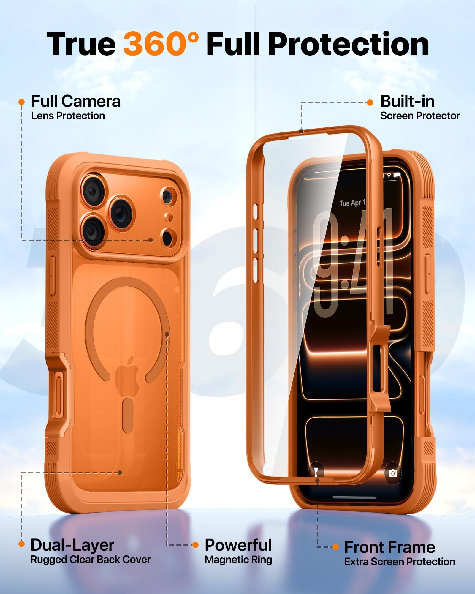 כיסוי מגנטי Diaclara לאייפון 17 פרו מקס, פגוש מלא, [תואם ל-MagSafe] כיסוי צבאי עמיד בפני נפילות עם מגן מסך מובנה נגד מגע ועמיד בפני שריטות, כתום