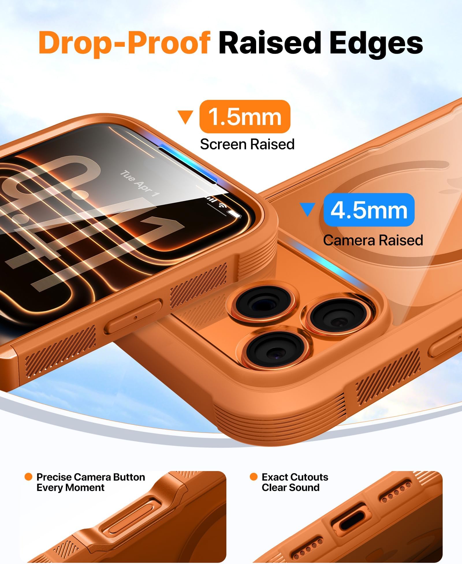 - 【הגנה נוספת למסך ולמצלמה】 קצה מסך מוגבה של 1.5 מ"מ וקצה מצלמה מוגבה של 3.8 מ"מ מספקים הגנה נוספת למסך הטלפון ולמצלמה.